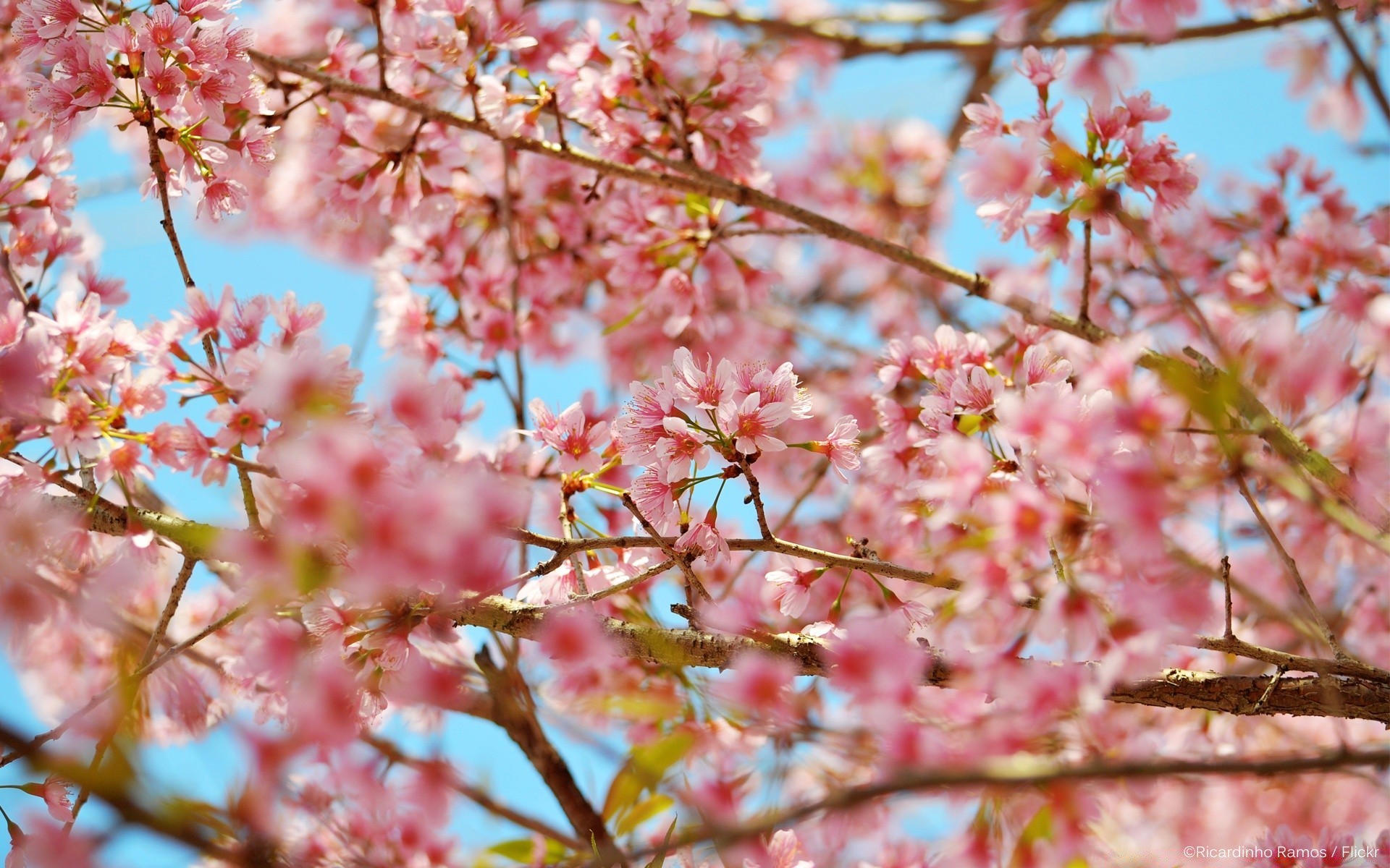 Mavi gökyüzünün arka planına karşı kiraz çiçeği dalları