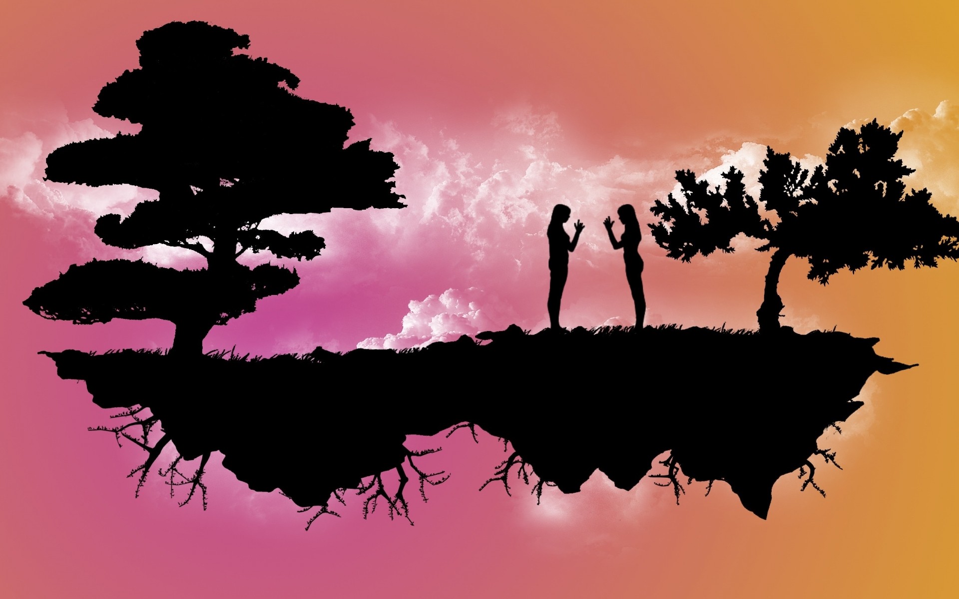 Soyut resim: Gün batımında ağaçların arasında iki kişi