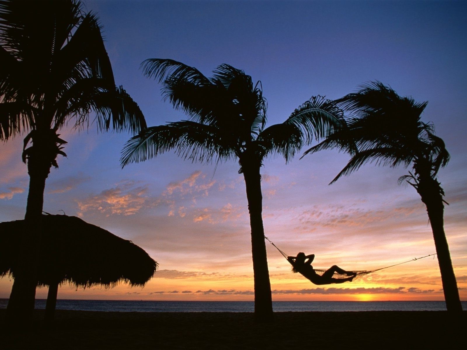 Palmiyeler, gün batımı, beyaz kum ve deniz, narin renklerdePalmiyeler, gün batımı, beyaz kum ve deniz, narin renklerde