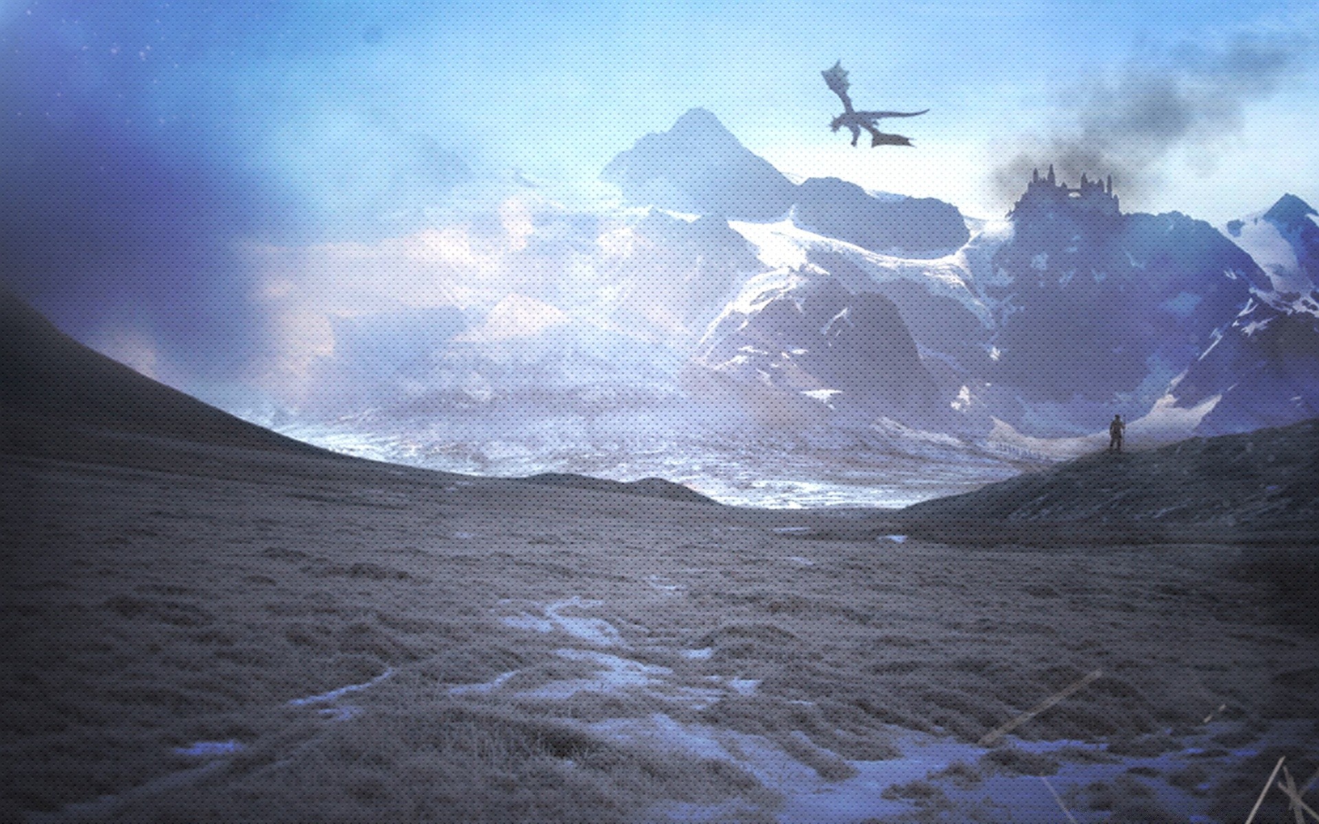 Dağ kalesinin üstündeki gökyüzünde ejderhanın uçuşu