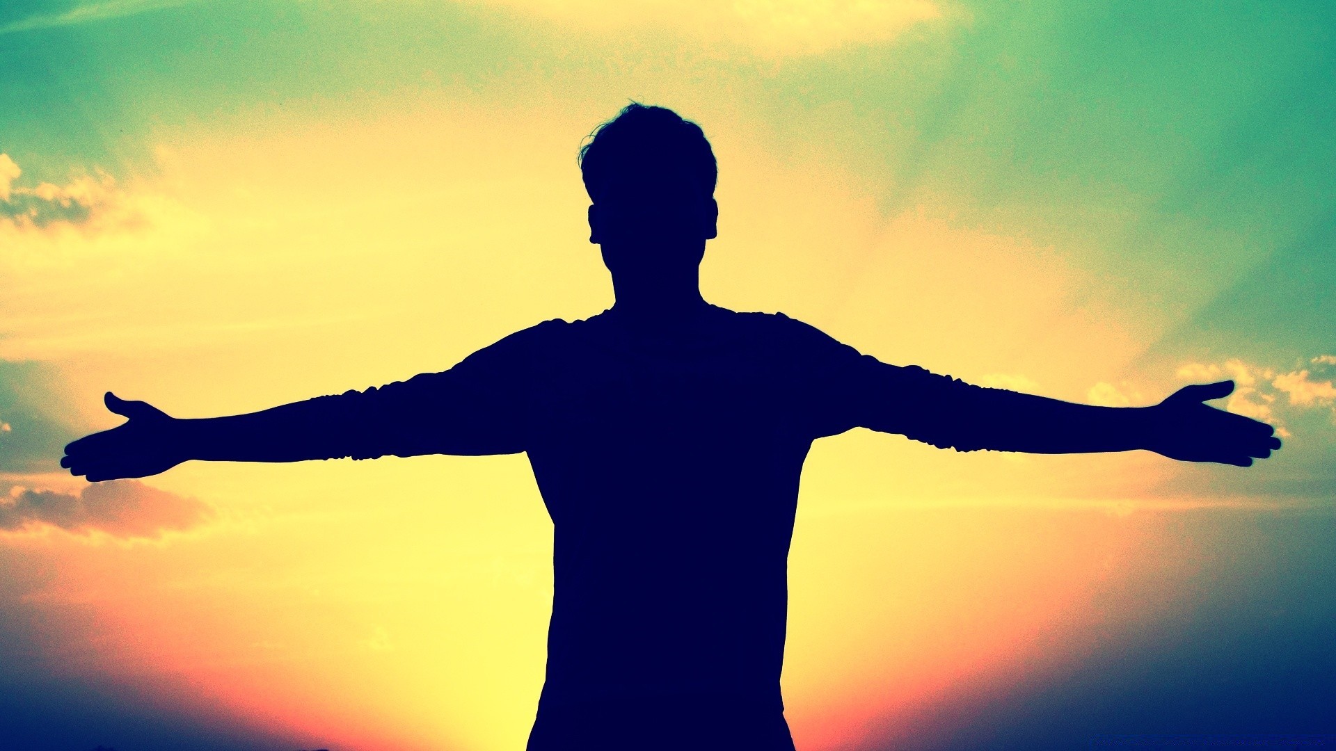 Gün batımını aydınlatan gökyüzünün arka planına karşı siyah erkek silueti
