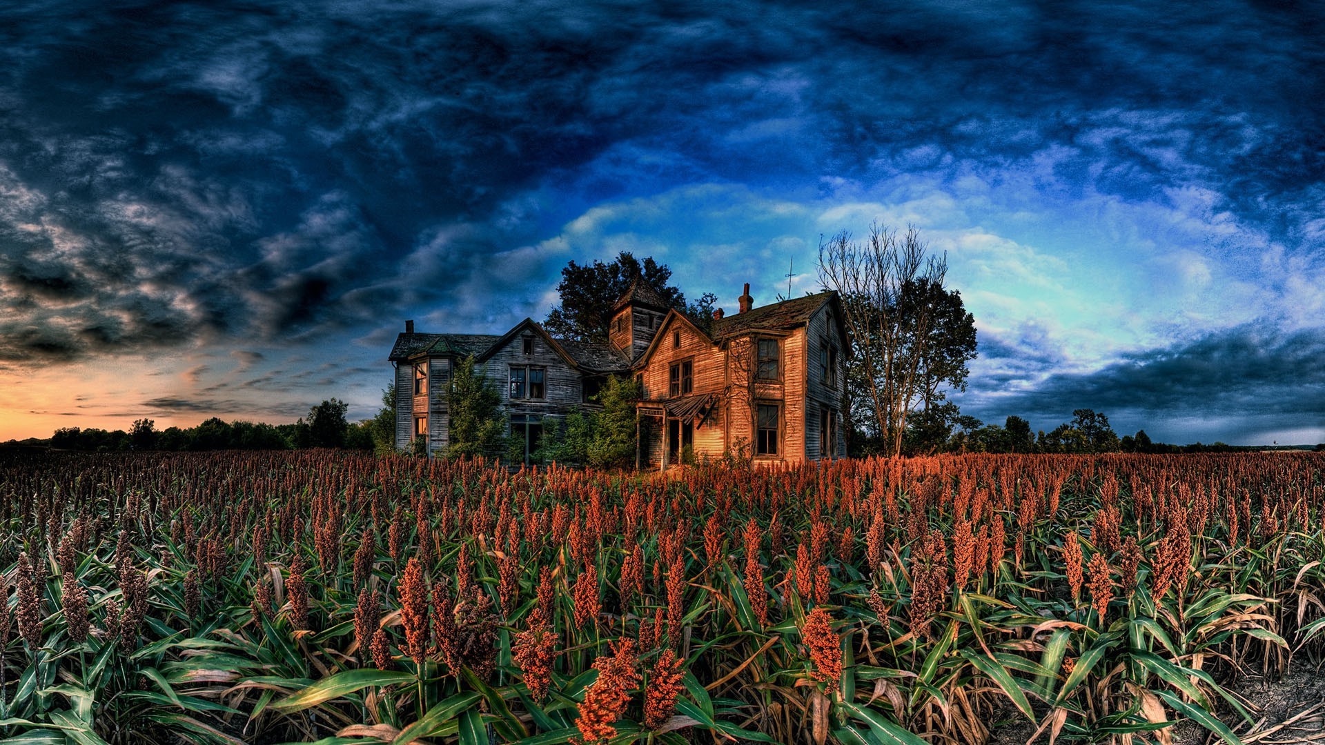 Fırtınadan önce mısır tarlasında eski bir çiftlik. Karanlık gökyüzü