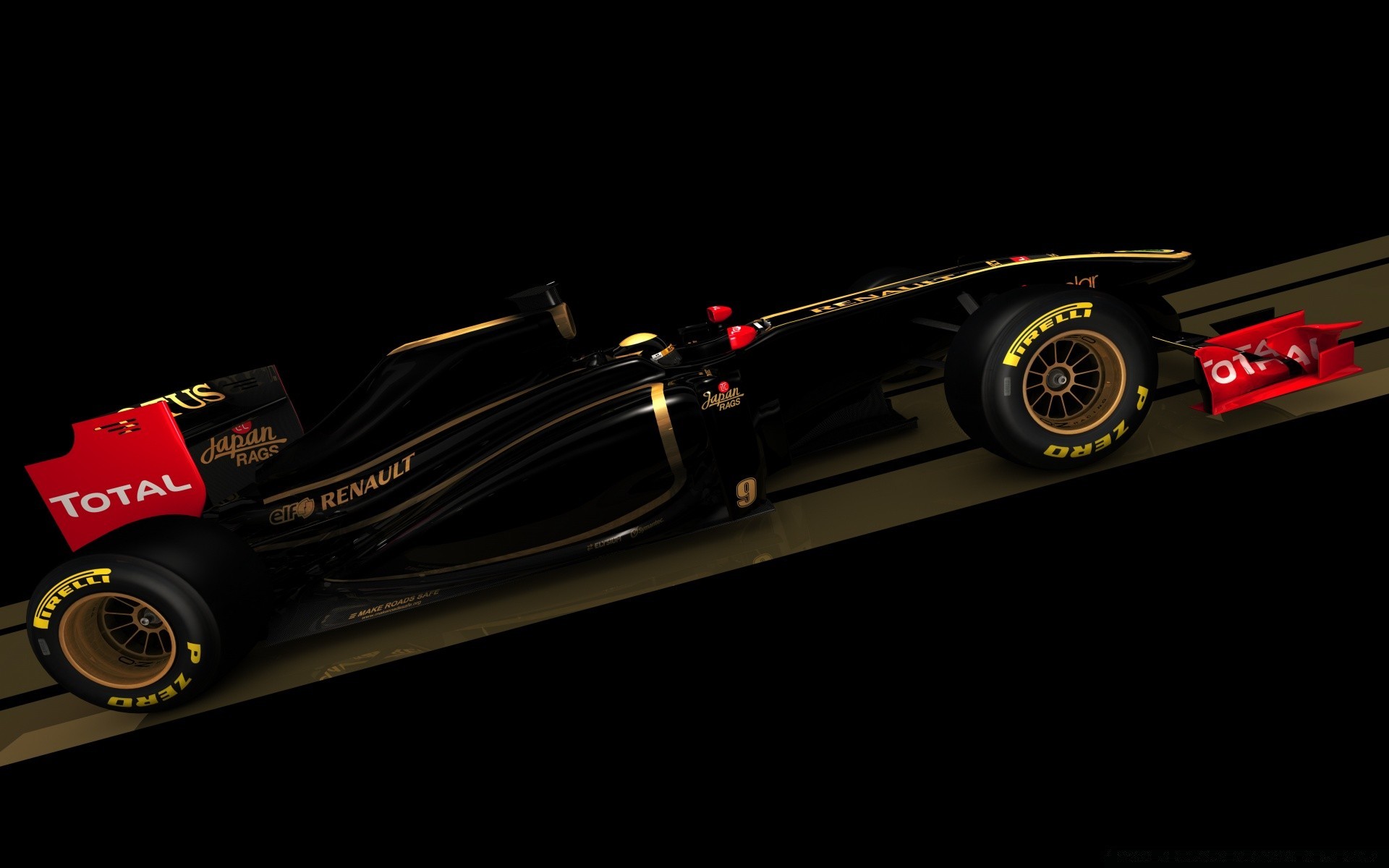 Siyah bir arka plana karşı siyah bir araba. Formula 1, sarı tekerlekler