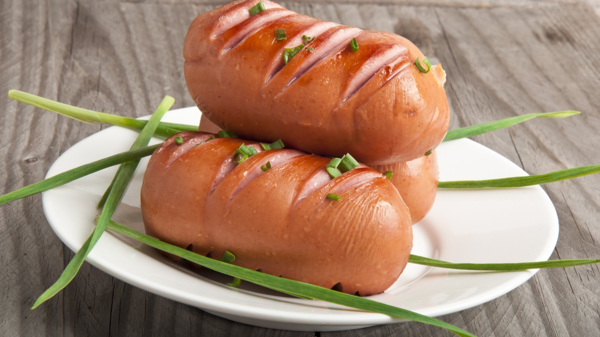 Sosisler kesilmiş ve soğanla pişirilmiş