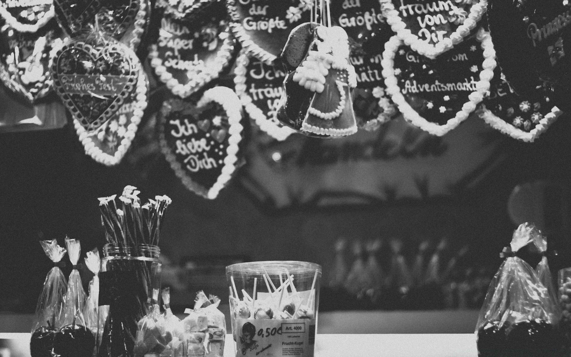 Yeni Yıl süslemelerinin siyah ve beyaz fotoğrafı