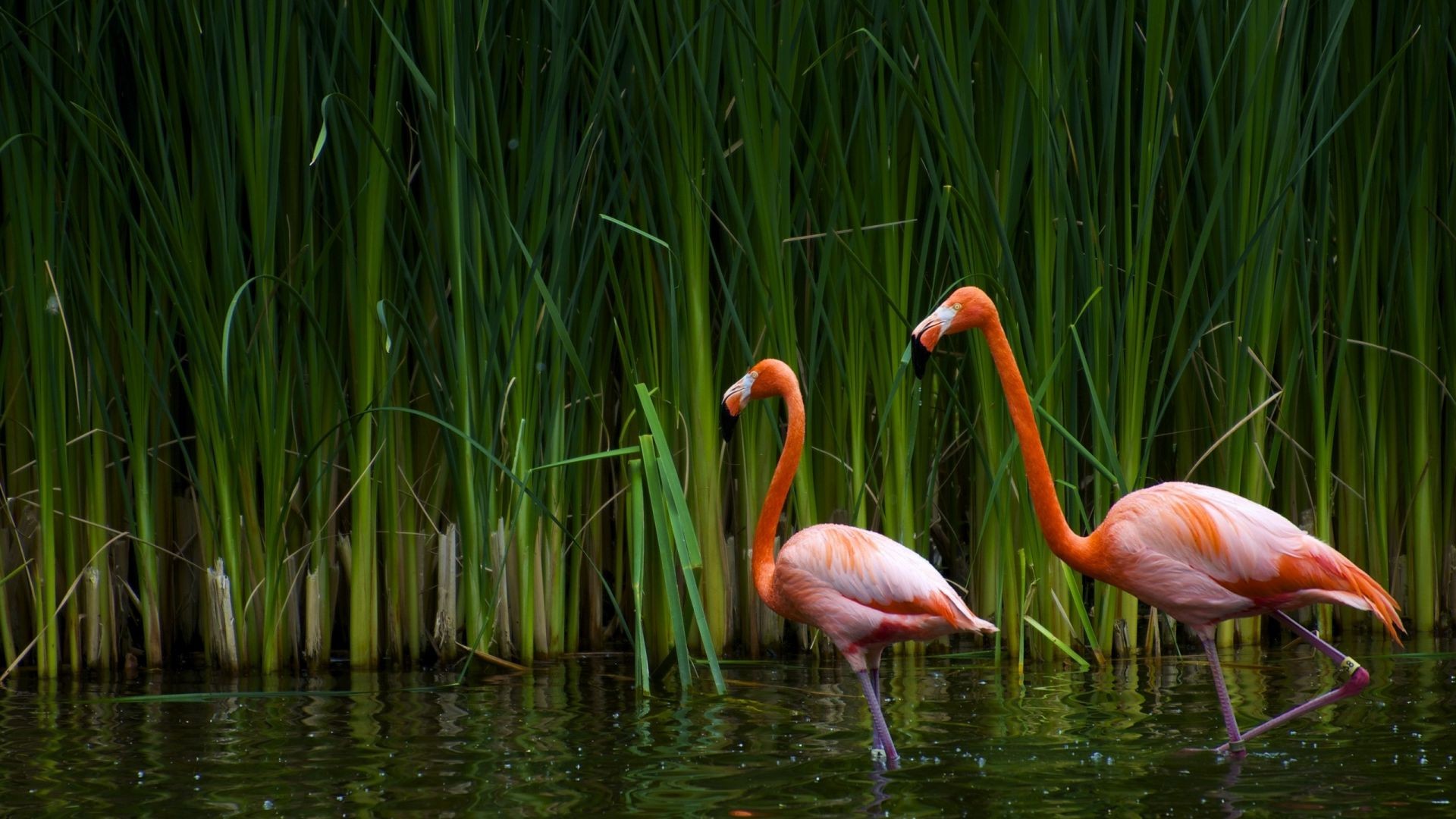 Kırmızı flamingolar sazların içinde gizlice dolaşıyor