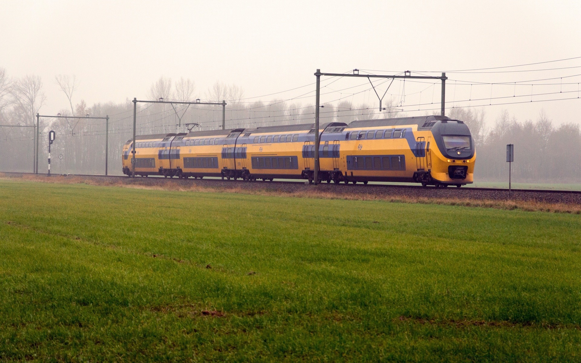 SİSLİ ÇİMLERİN ARKA PLANINDA SİSLİ ELEKTRİKLİ TREN
