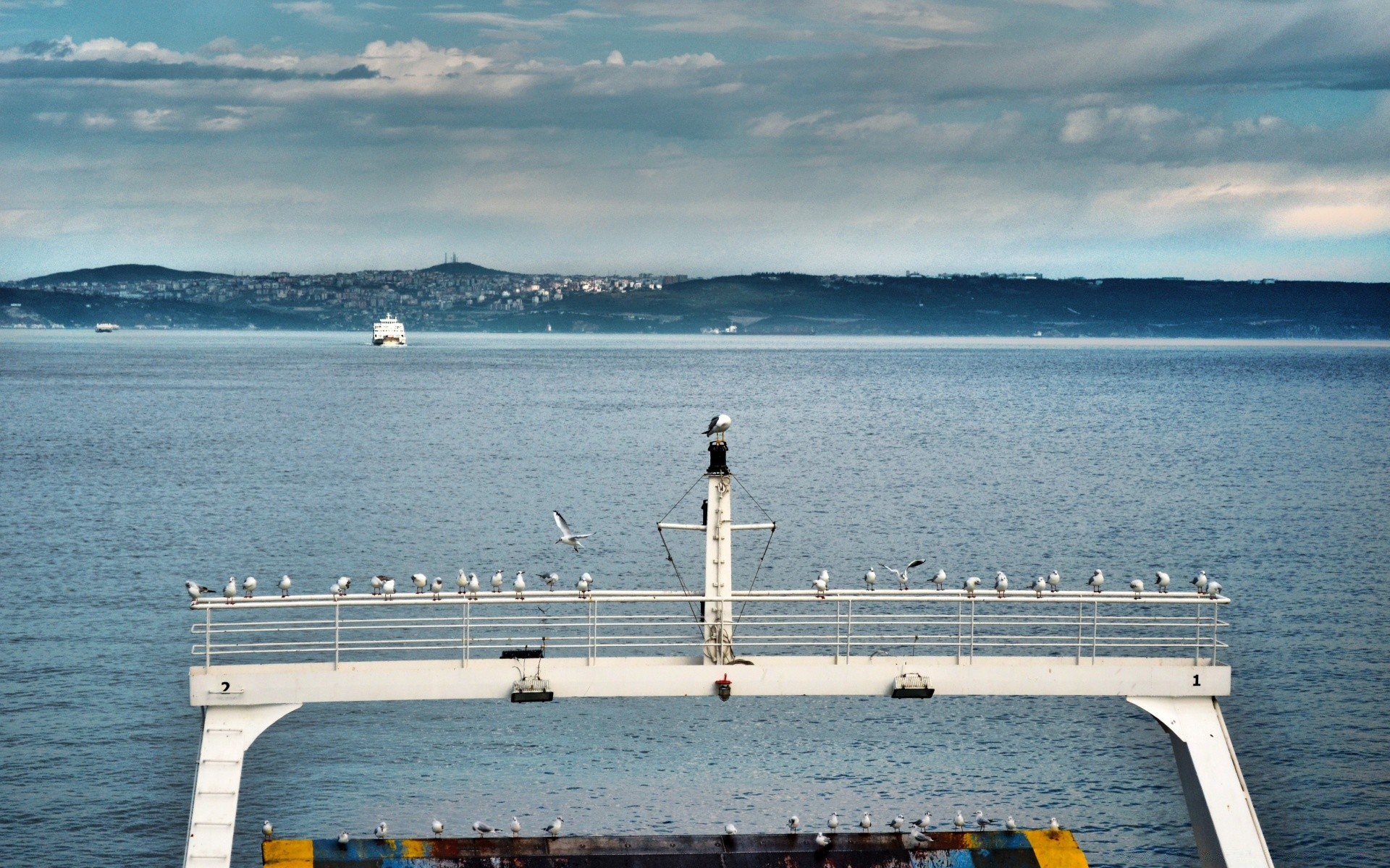 Arka planda dağları olan bir gemiden denizin fotoğrafı
