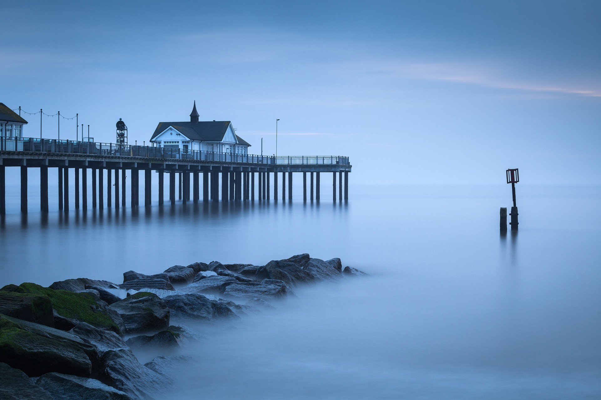 Gölün ve mavi gökyüzünün karşısındaki köprü