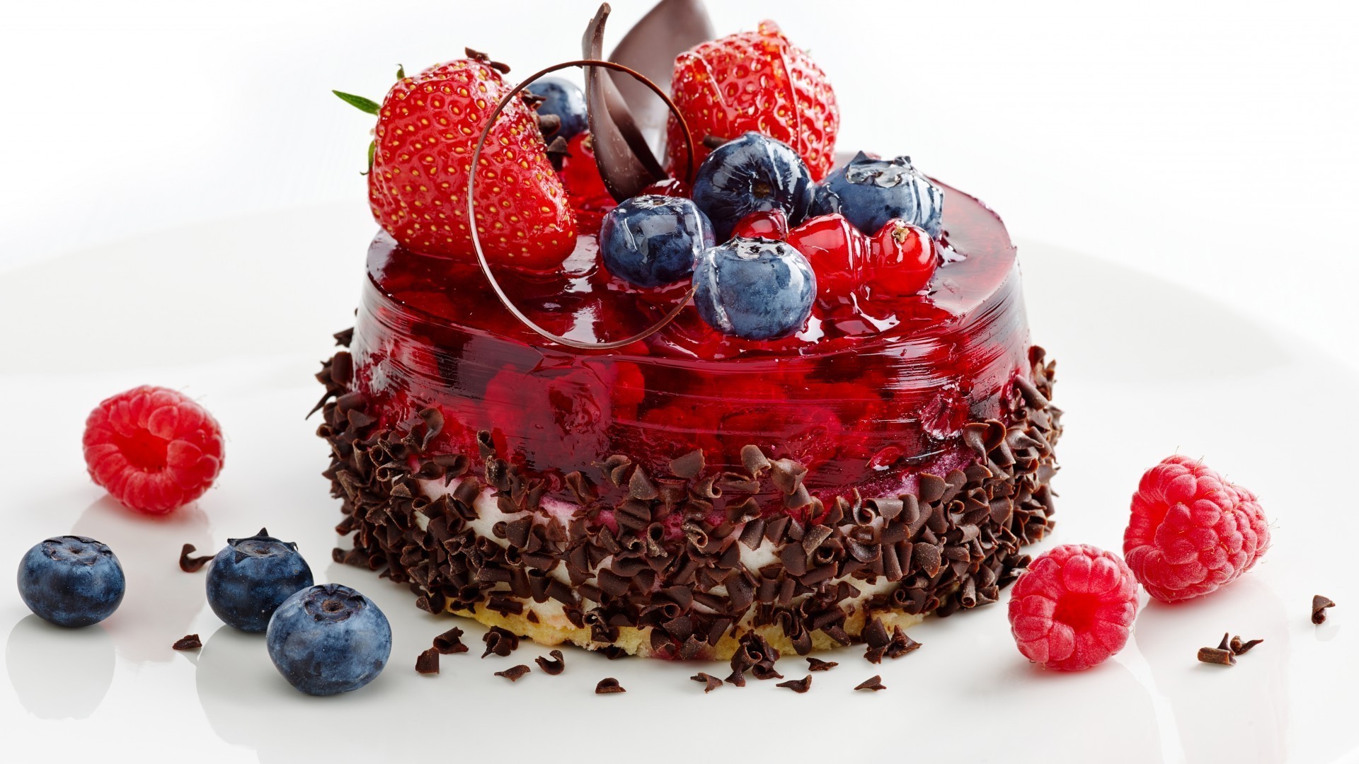 Meyvelerle süslenmiş jöle ve çikolatalı tatlı