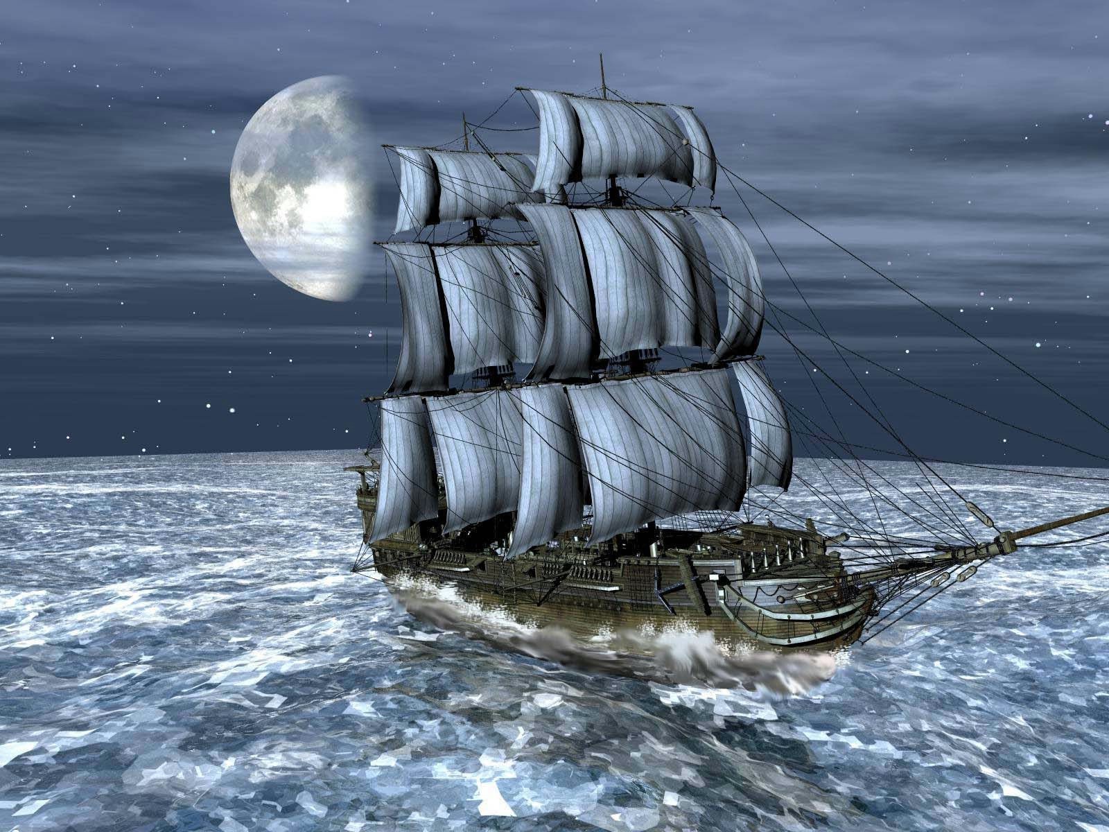 Fırtınalı denizde büyük bir yelkenli ve büyük ay onun yolunu aydınlatıyor