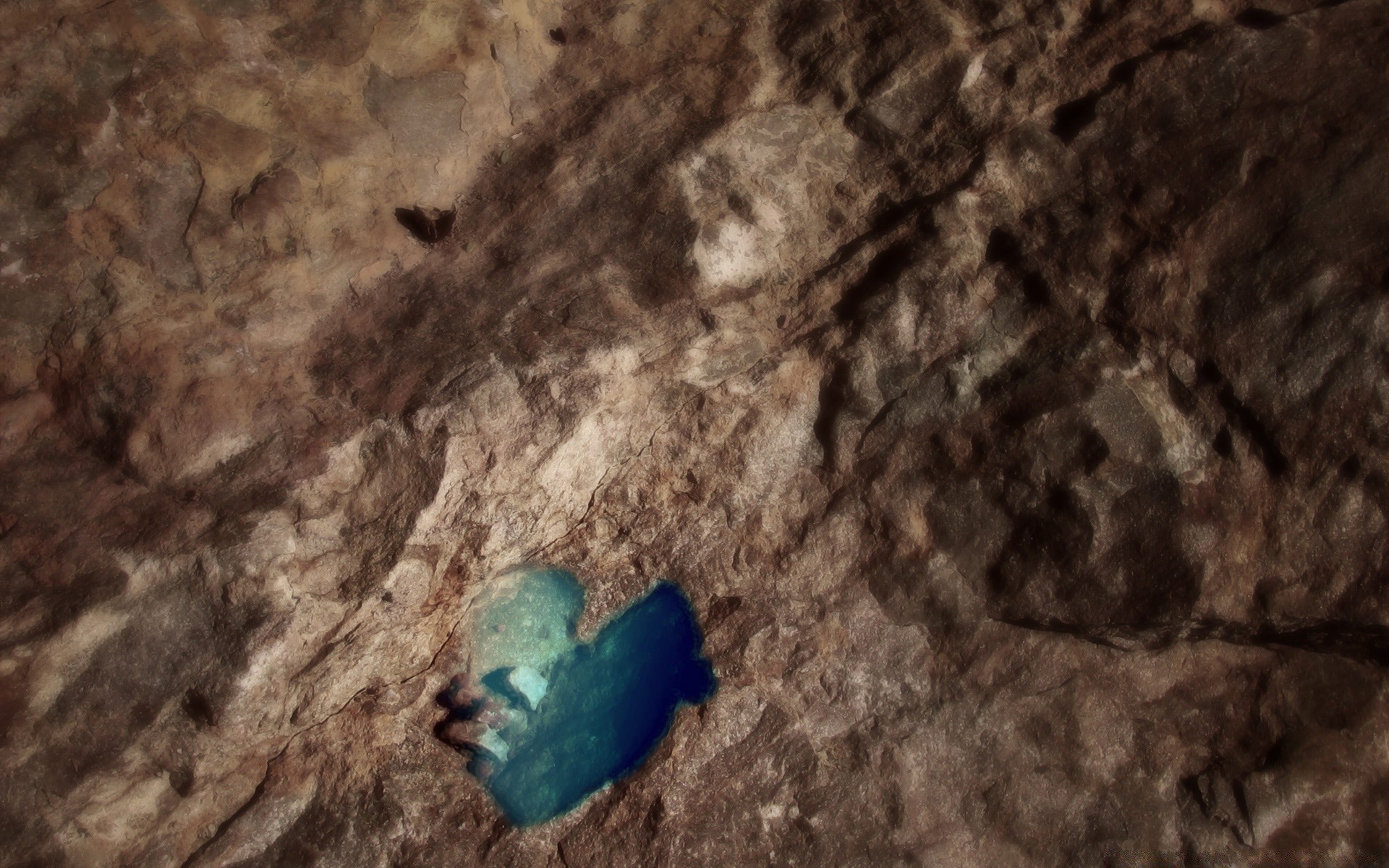 Berrak gökyüzünün arka planına karşı kayalık bir sahil, nehrin sularına yansır