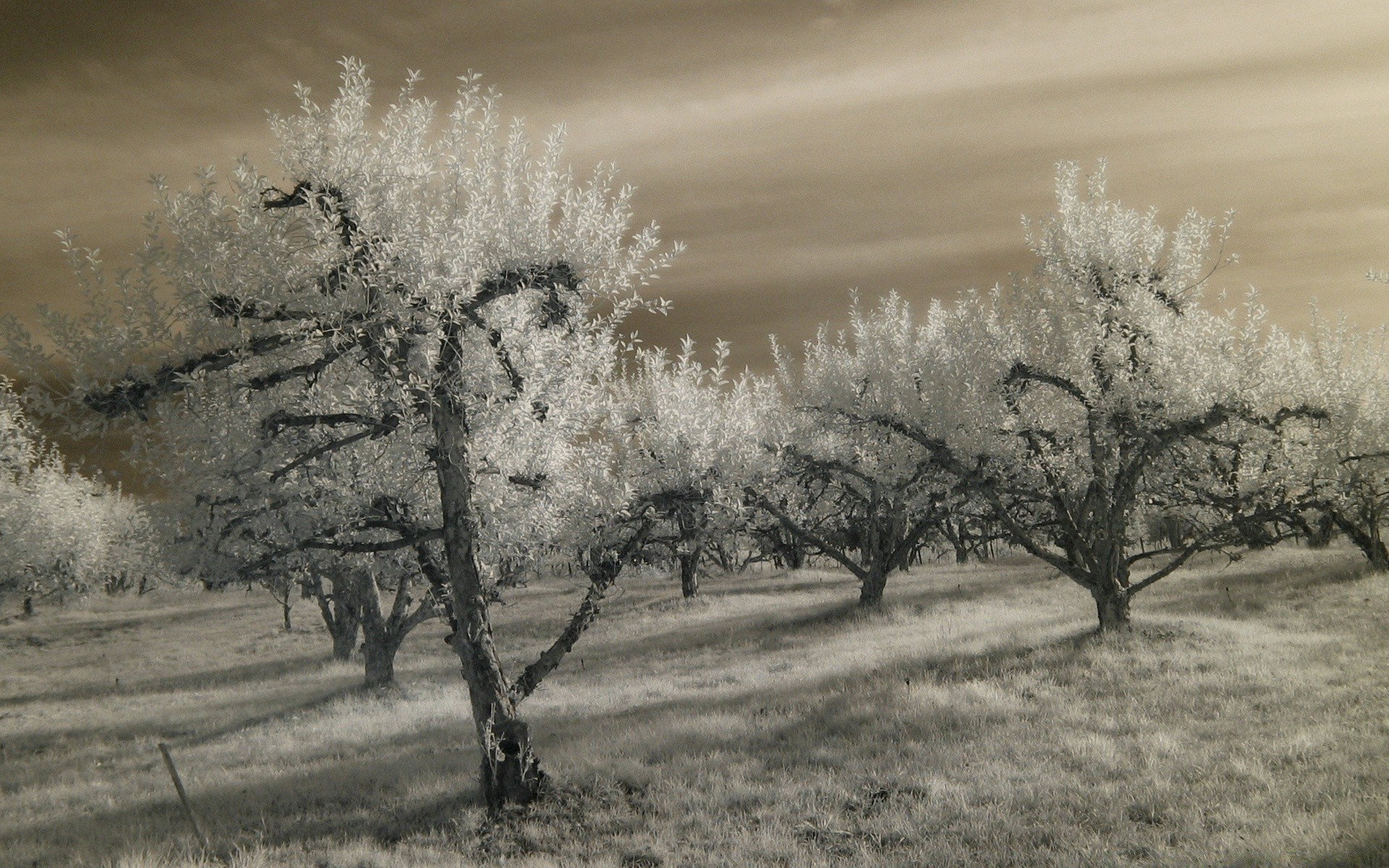 Ağaçların ve gökyüzünün siyah beyaz görüntüsü