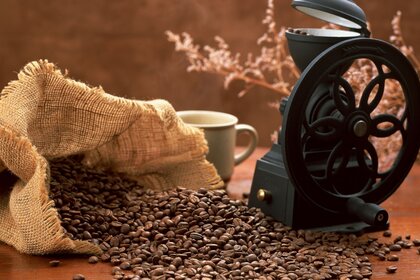Tahıldan ve kaşıkta bir fincan koyu kahve