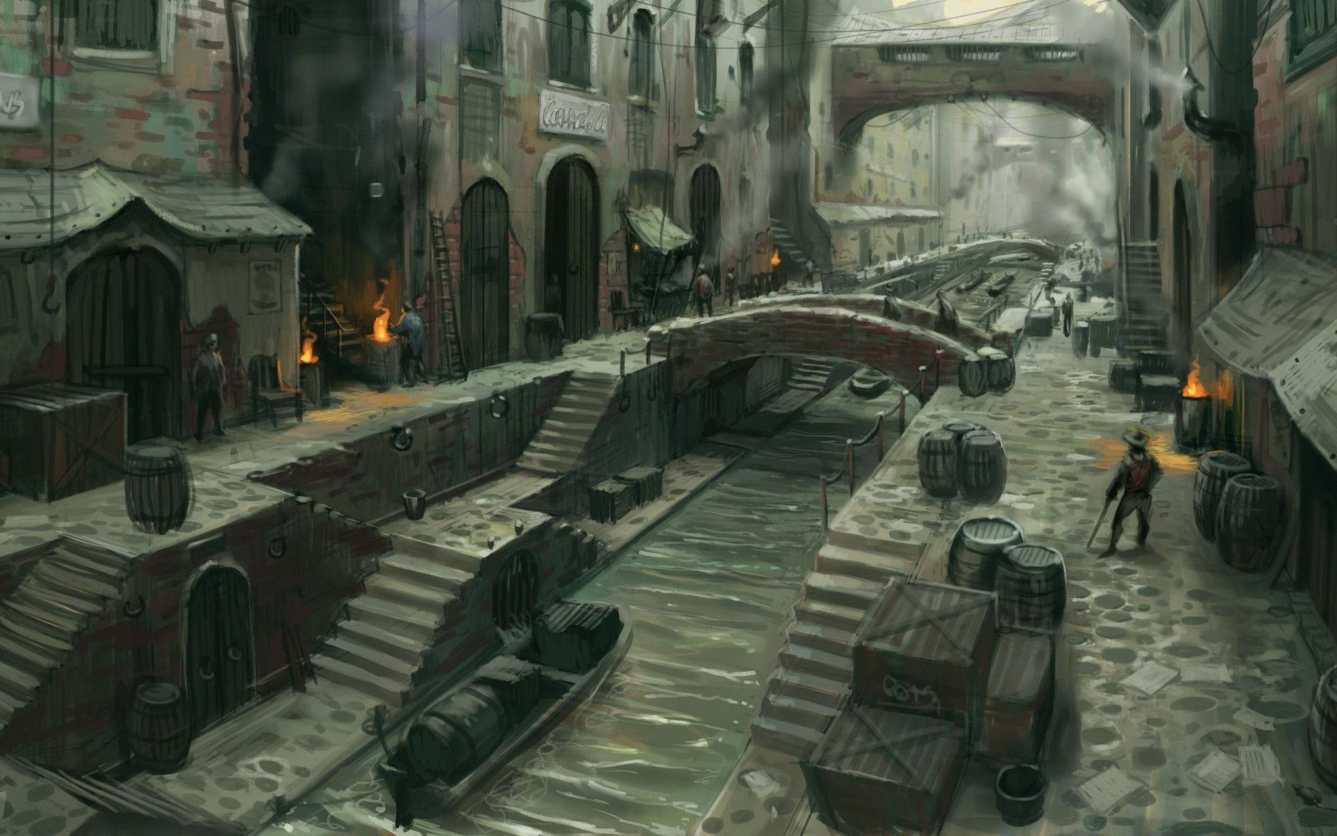 Kanalın üzerindeki taş sokaklar ve köprüler