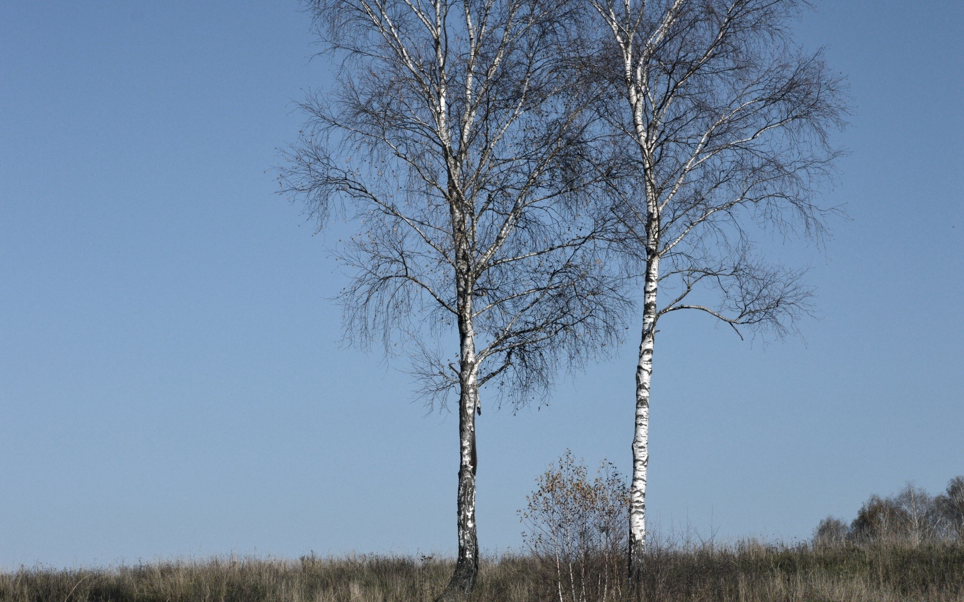 Gökyüzünün arka planına karşı iki huş ağacı