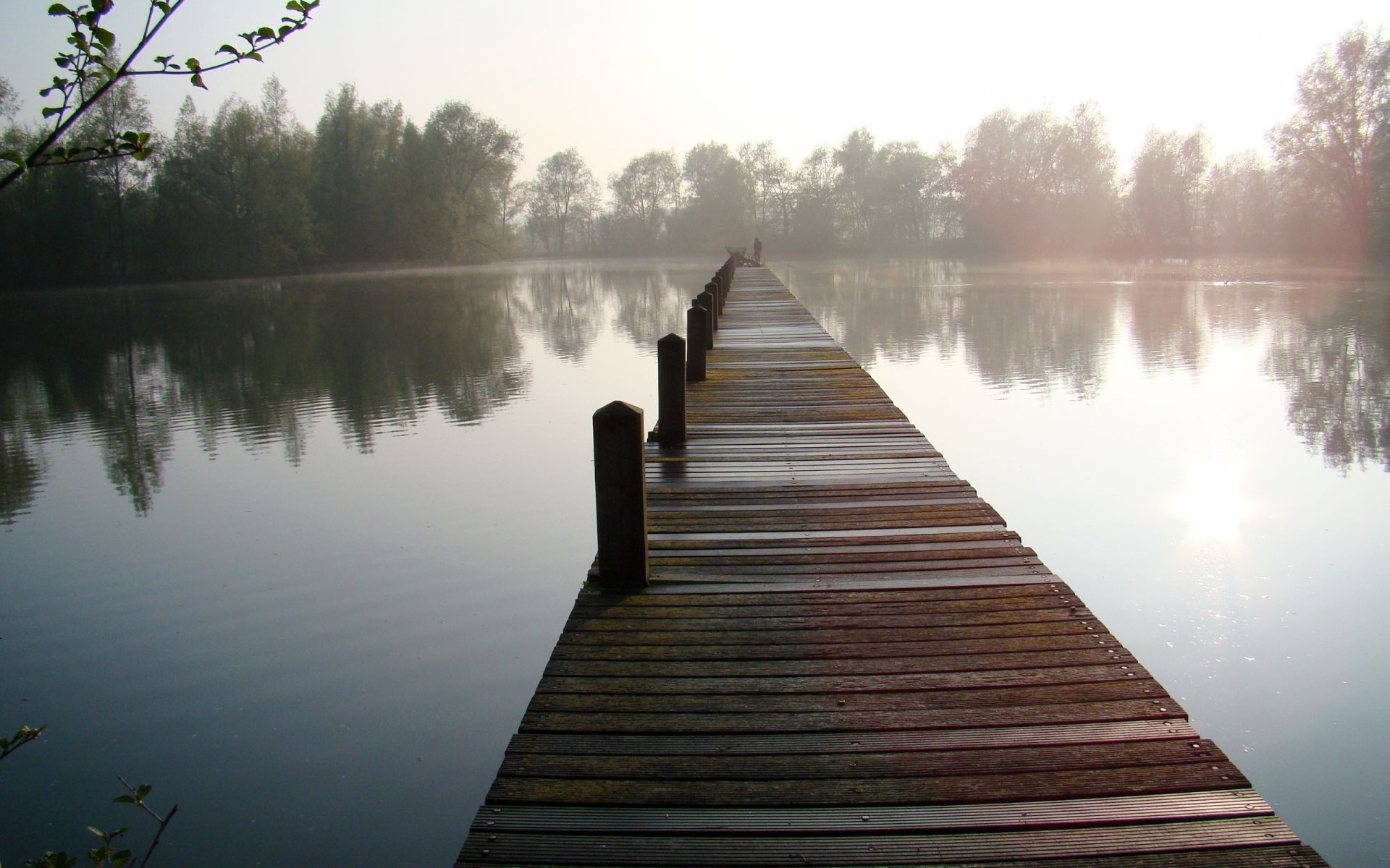 Sakin bir gölün karşısındaki köprü, sakin sudaki ağaçların yansıması