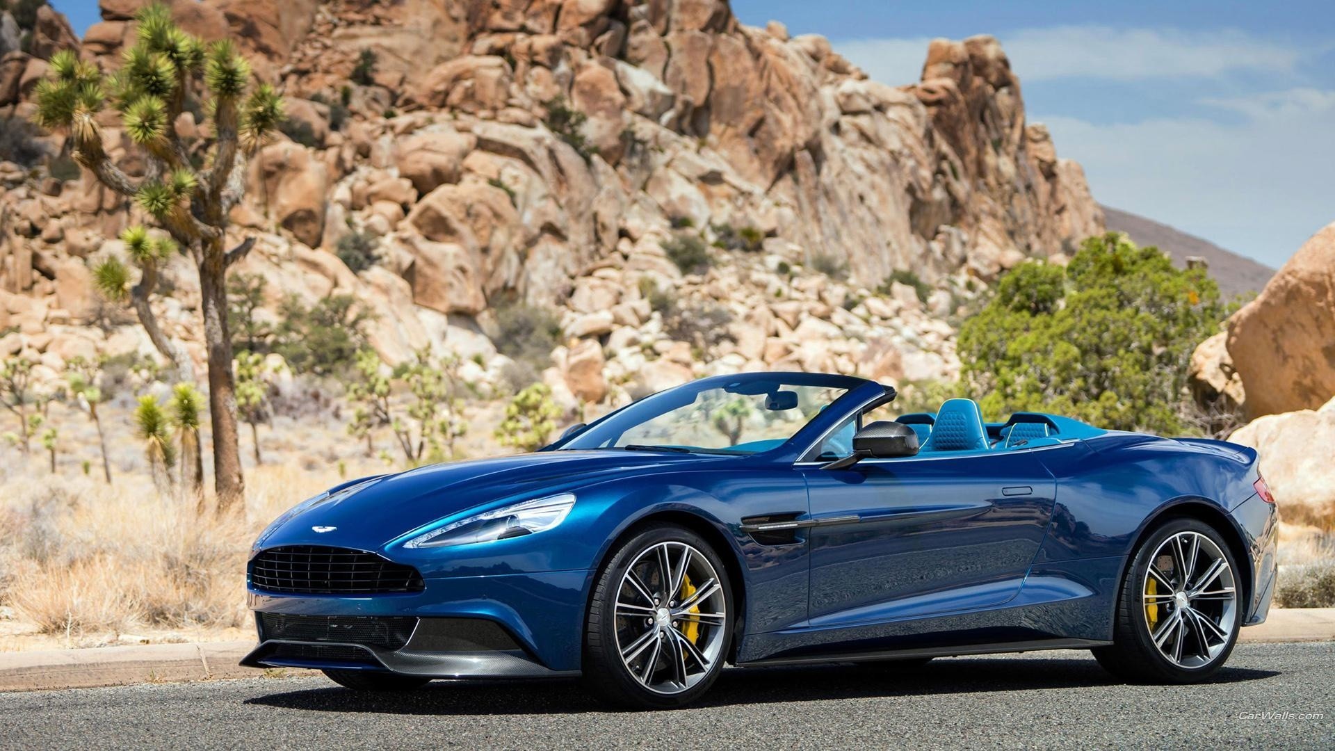 Dağların zemininde krom jantlara sahip mavi bir üstü açılır araba