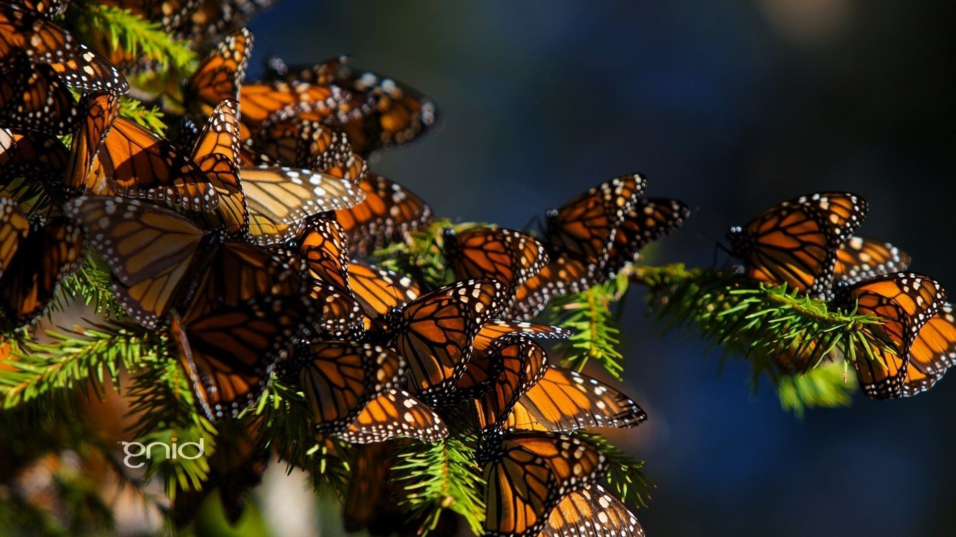 Gözleri kapalı kızlar pembe kelebekler tarafından çevrelenmiştir
