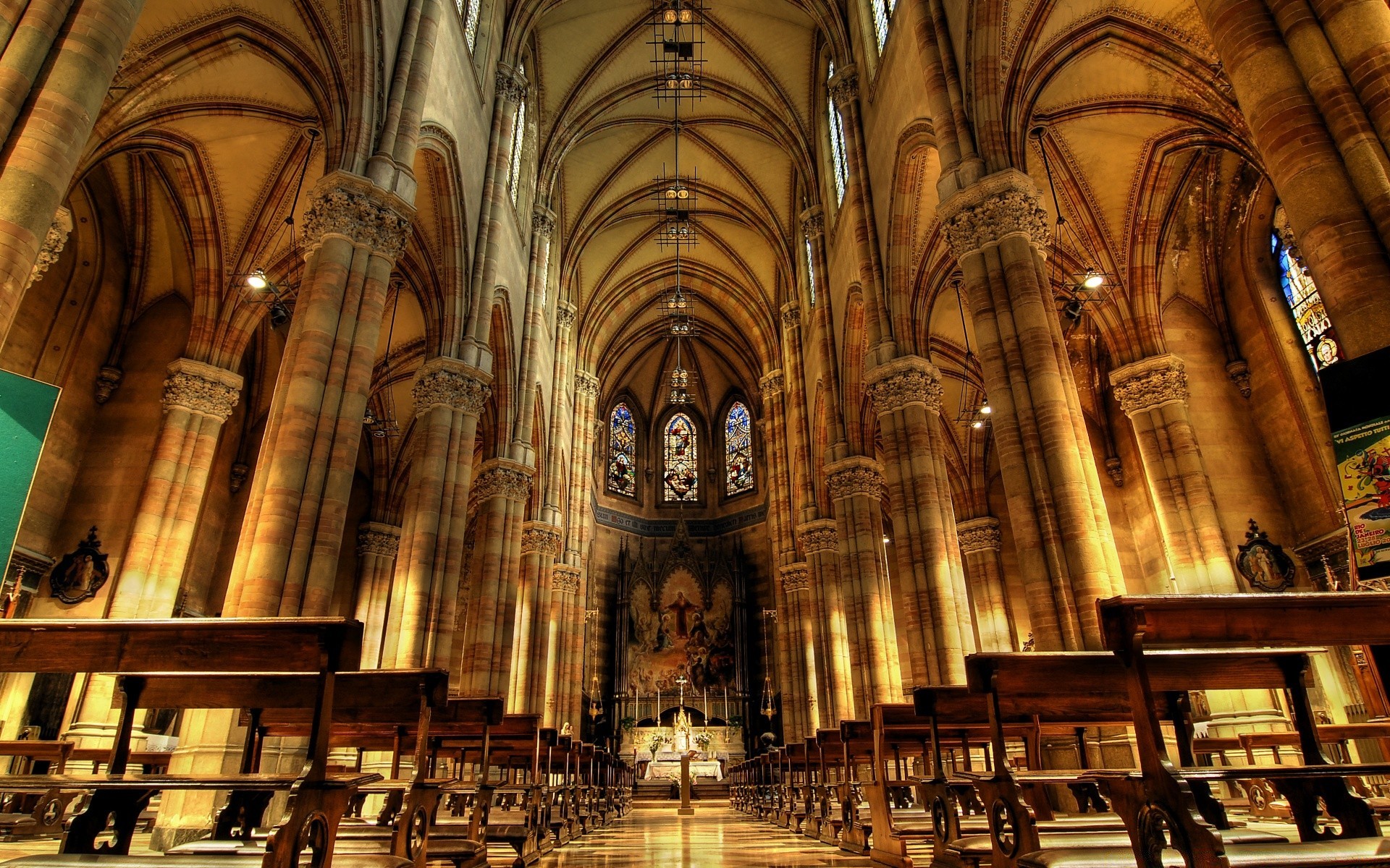 Katedralin yüksek tonozları renkli cam desenlerle dekore edilmiştir