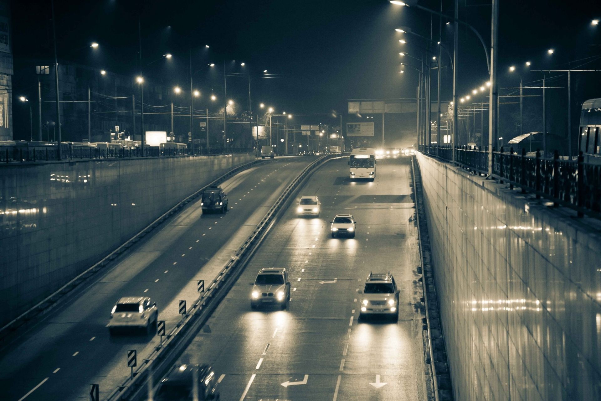 Binaların çok renkli aydınlatmasıyla kentsel mimarinin görüntüsü