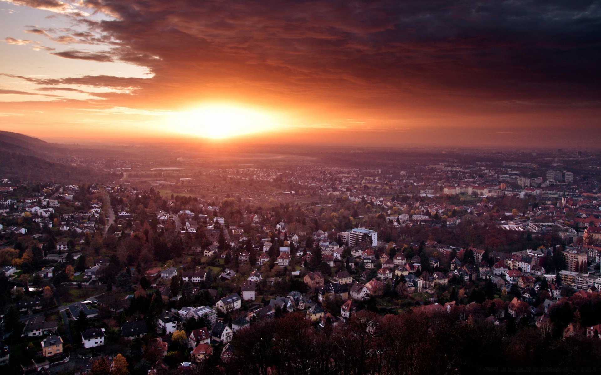 Geceleri gölün arka planına karşı kentsel gün batımıGeceleri gölün arka planına karşı kentsel gün batımı