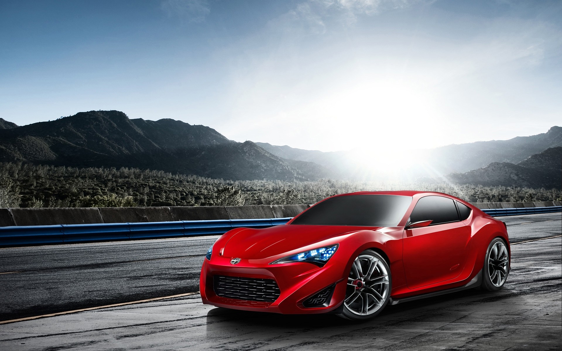 Yolda dağlarda kırmızı spor arabası