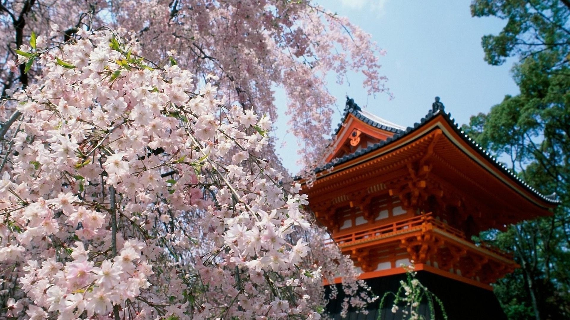 Mavi bir arka plan üzerinde kiraz çiçeği dalı