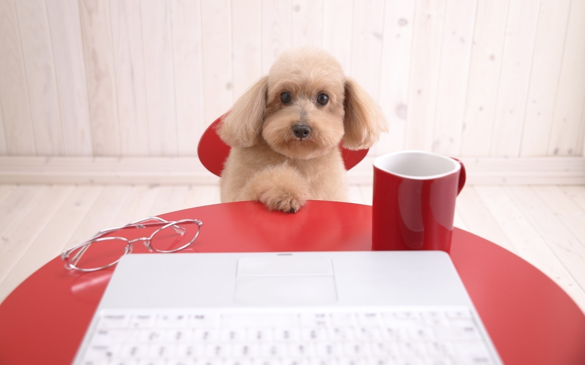 Dizüstü bilgisayarında bir fincan kahve bulunan kulaklı köpek