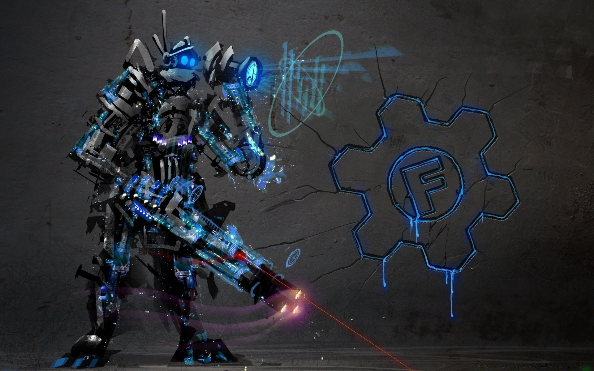 İnsanlar ve robotlar silahlarla savaşıyorlar