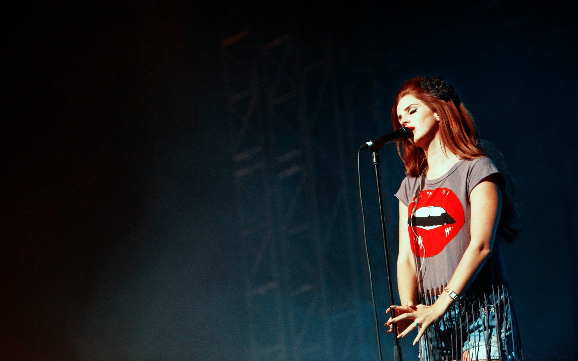 Sarışın kız kırmızı mikrofona şarkı söylüyor