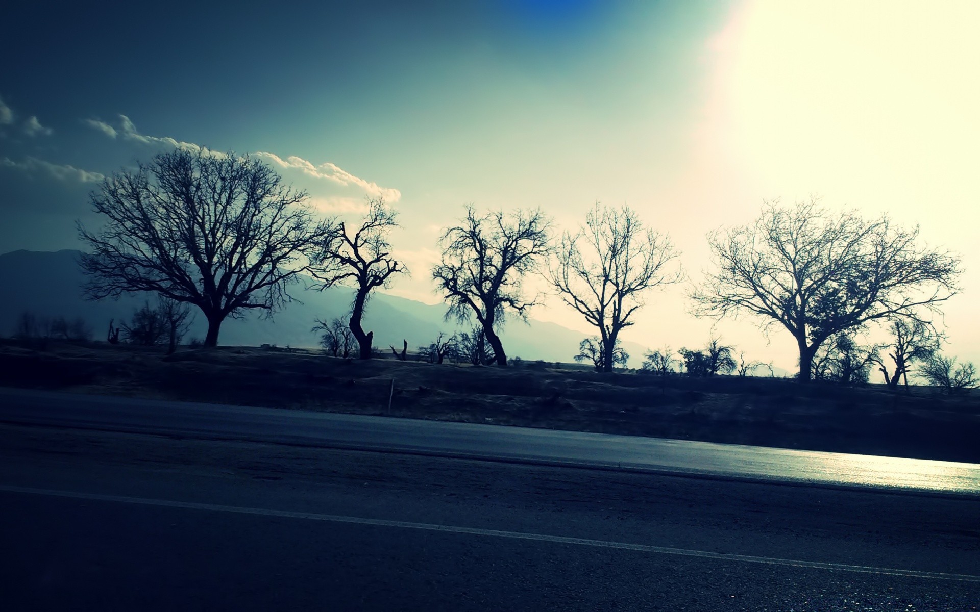 Ağaçlar ve gökyüzü. Yol. Manzara