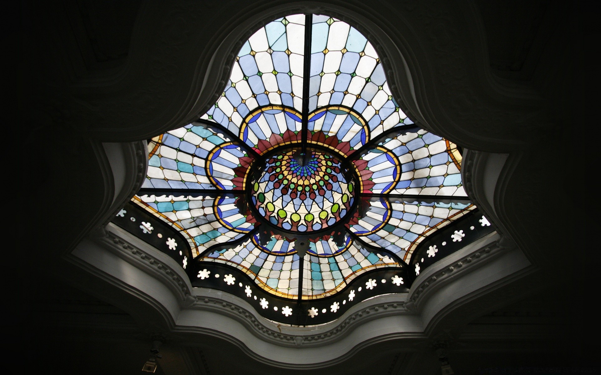 İç mekanda, binanın tavanında renkli cam süslemeli karmaşık bir kubbe vardır