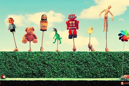 Çitin üzerindeki çubuklardaki farklı oyuncaklar