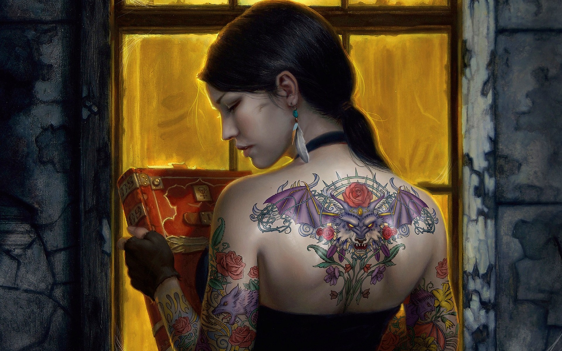 Sırtında dövmeli ve elinde bir kitap olan kız