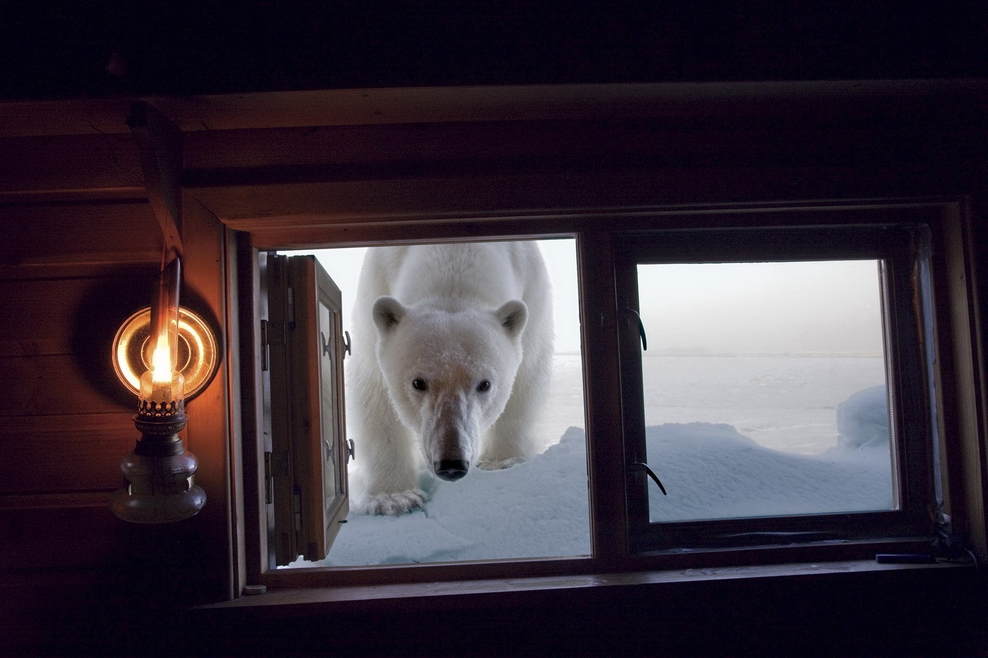 Kışın buz kütlesinde bir ayı yavrusu olan bir ayı