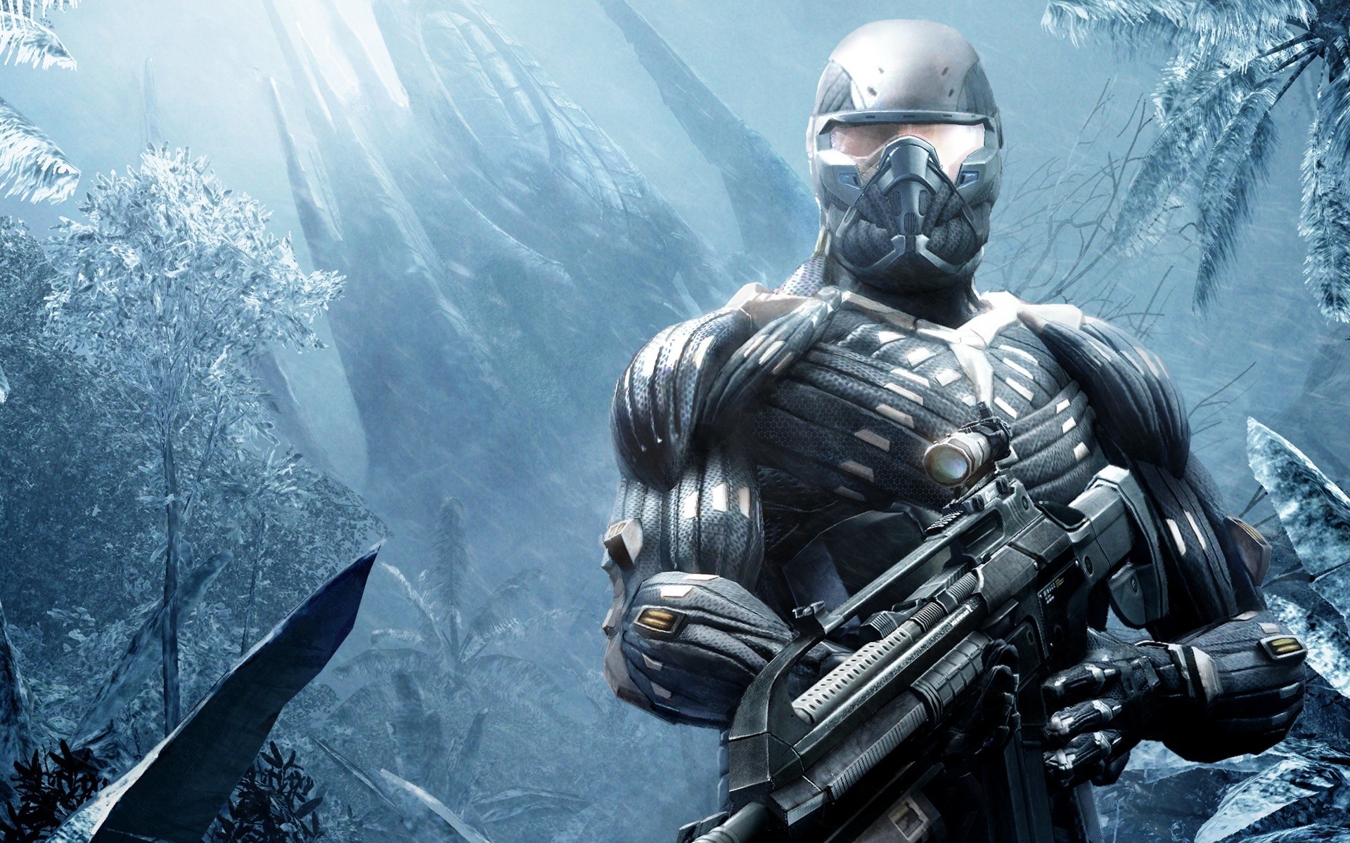 Oyunun Farcry kahramanı, silahlı, dağ manzarasının arka planına karşı ayakta