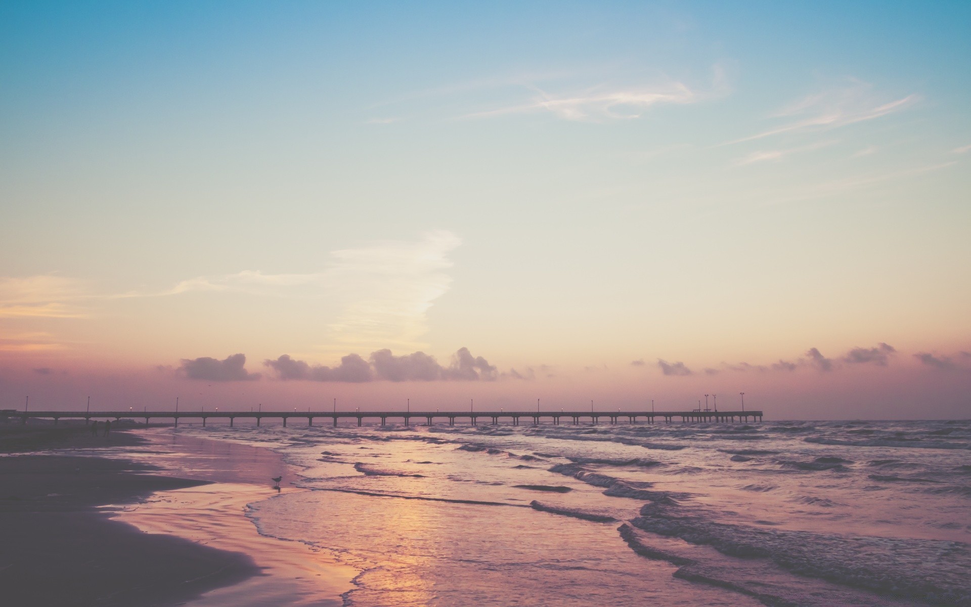 Uzaktaki köprü ve pembe ve mavi gökyüzünün arka planına karşı dalgalar