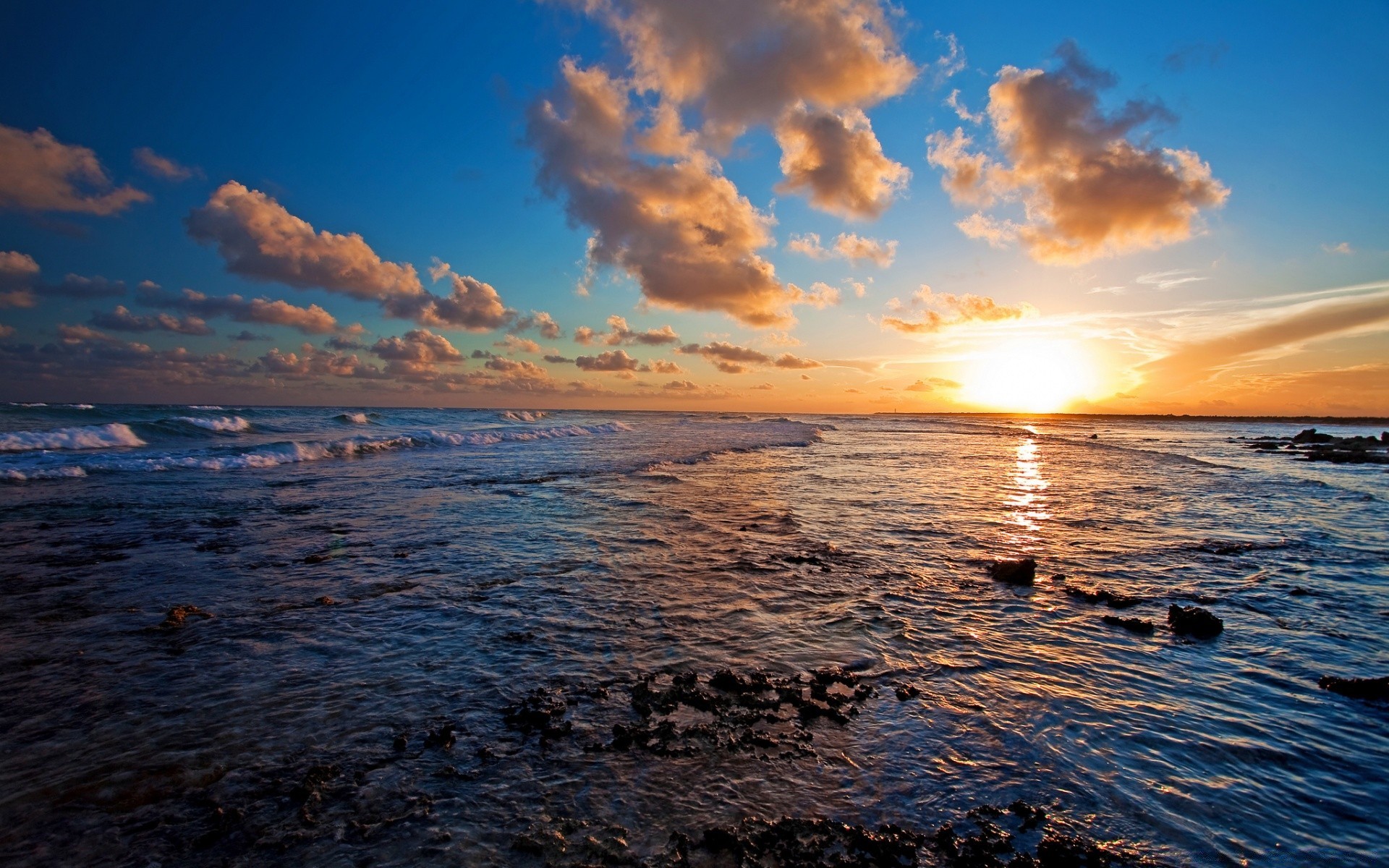 Batan güneşin ışığında deniz yüzeyinde tekneler