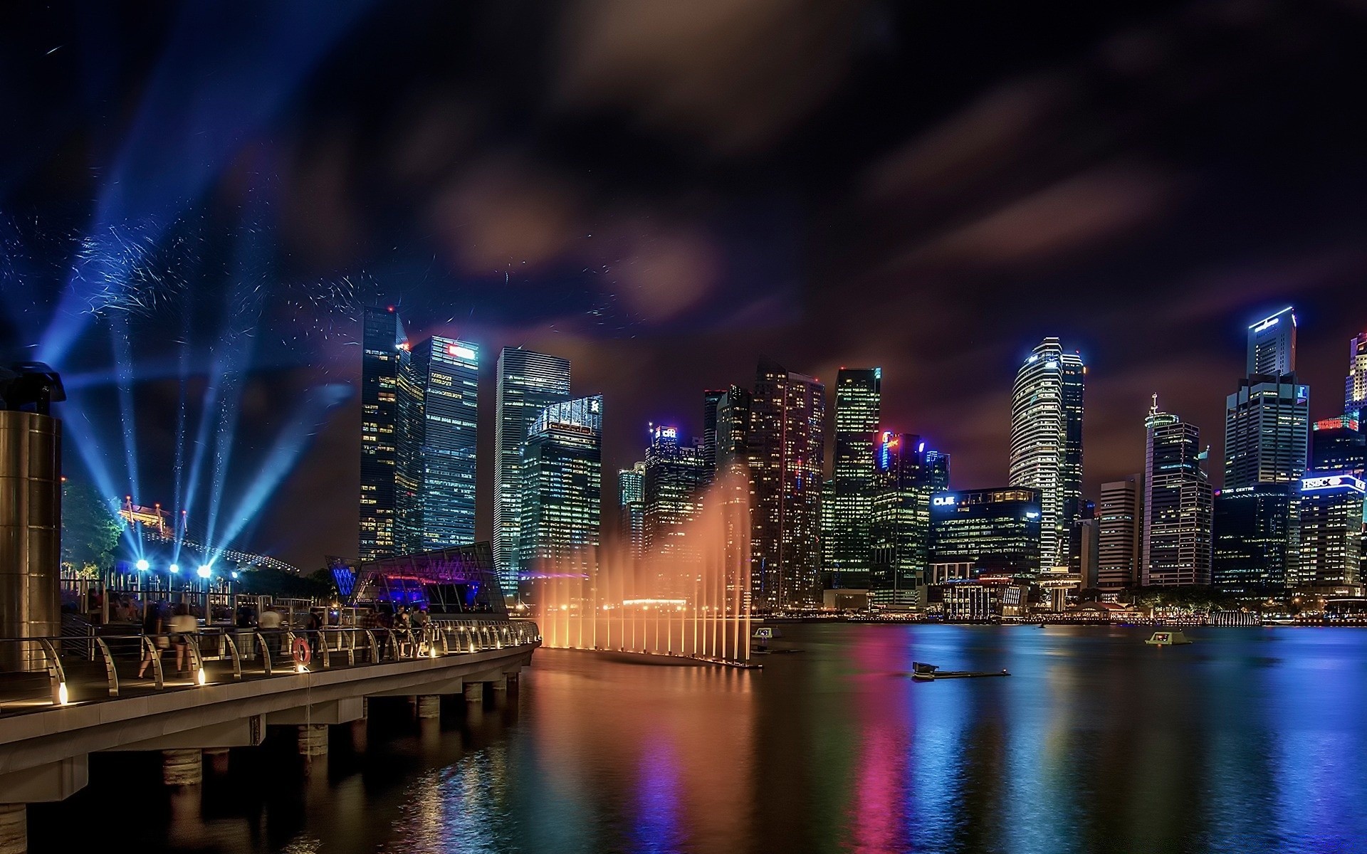 Mavi projektörlerin ışığında kentsel gökdelenler