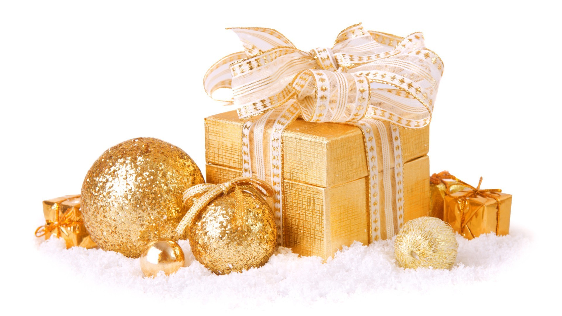 Yılbaşı oyuncakları ve köknar dalları arasında beyaz bir fiyonklu kırmızı renkli hediye kutusu