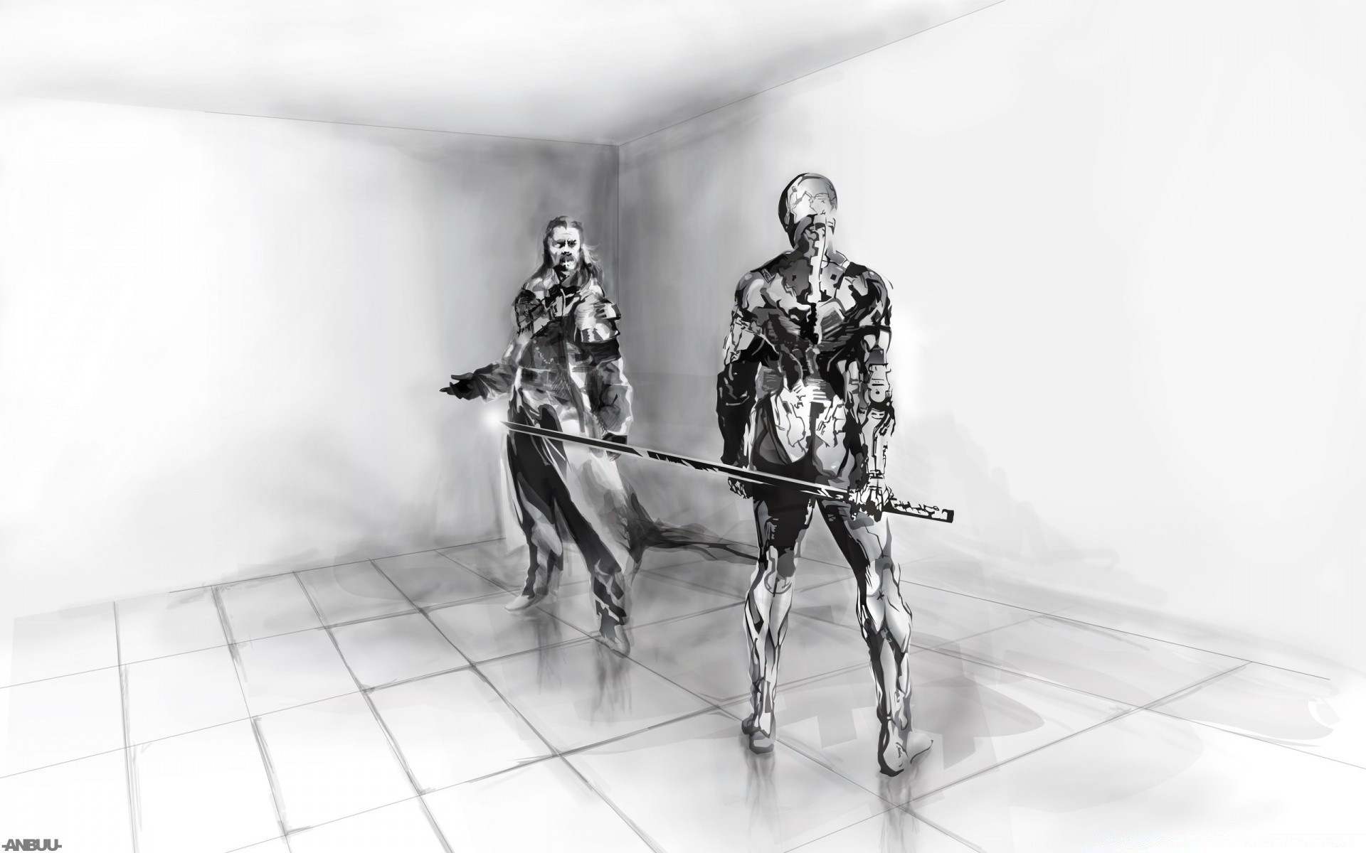 Metal gear kahramanının dövüş standında kılıcıyla yakın görüntüsüMetal gear kahramanının dövüş standında kılıcıyla yakın görüntüsü