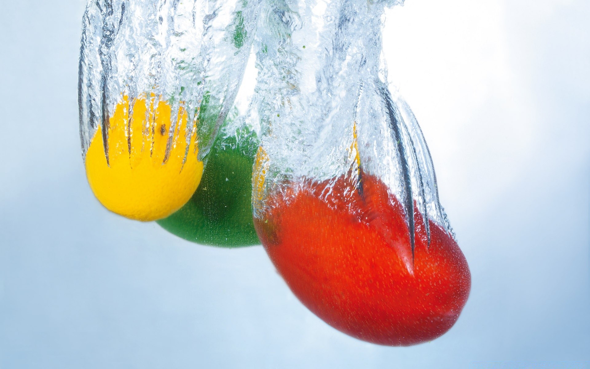 Parlak sarı, kırmızı ve yeşil meyveler suya düşer