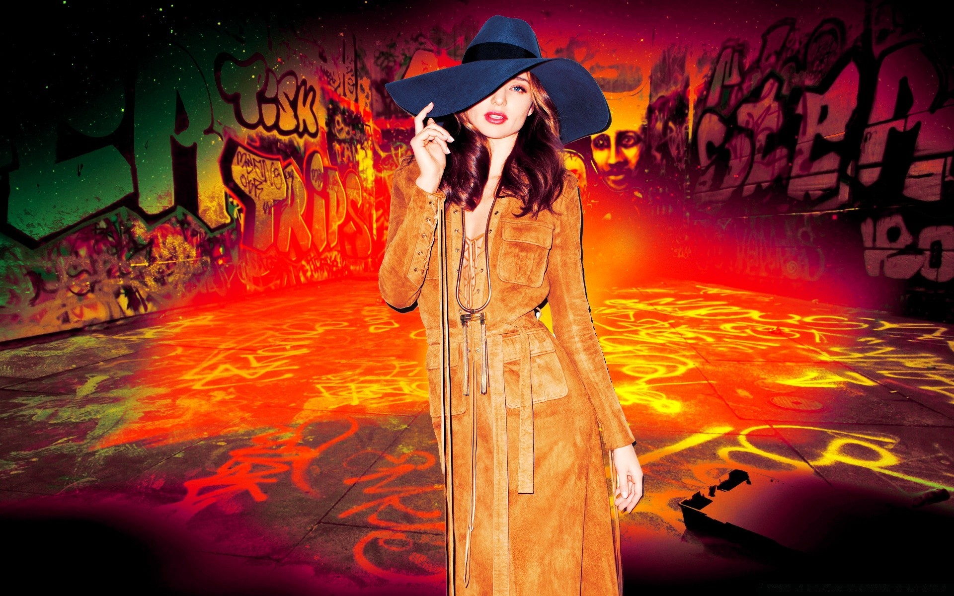 Ateşli grafiklerin arka planına karşı şapkalı kız