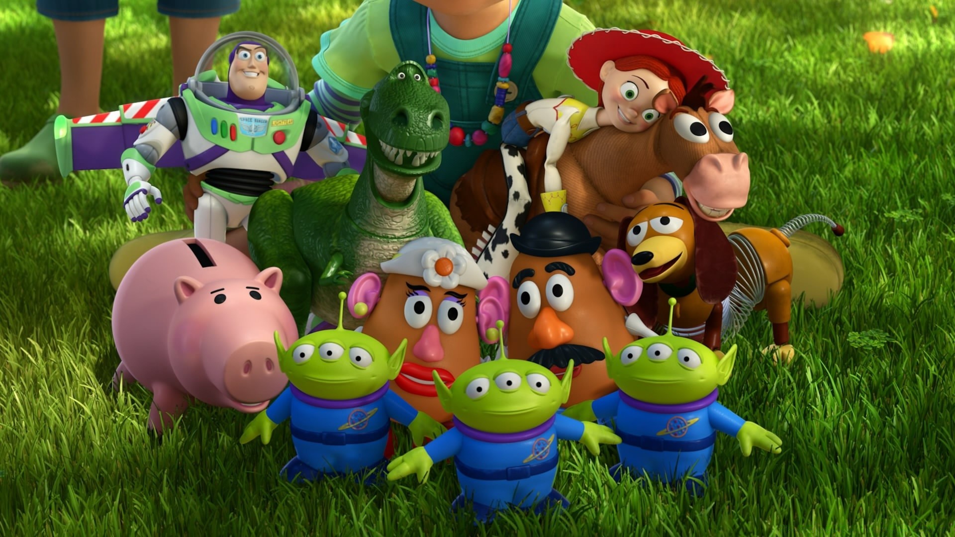 Toy story 3 karikatüründen çimlerdeki ana karakterlerle resim