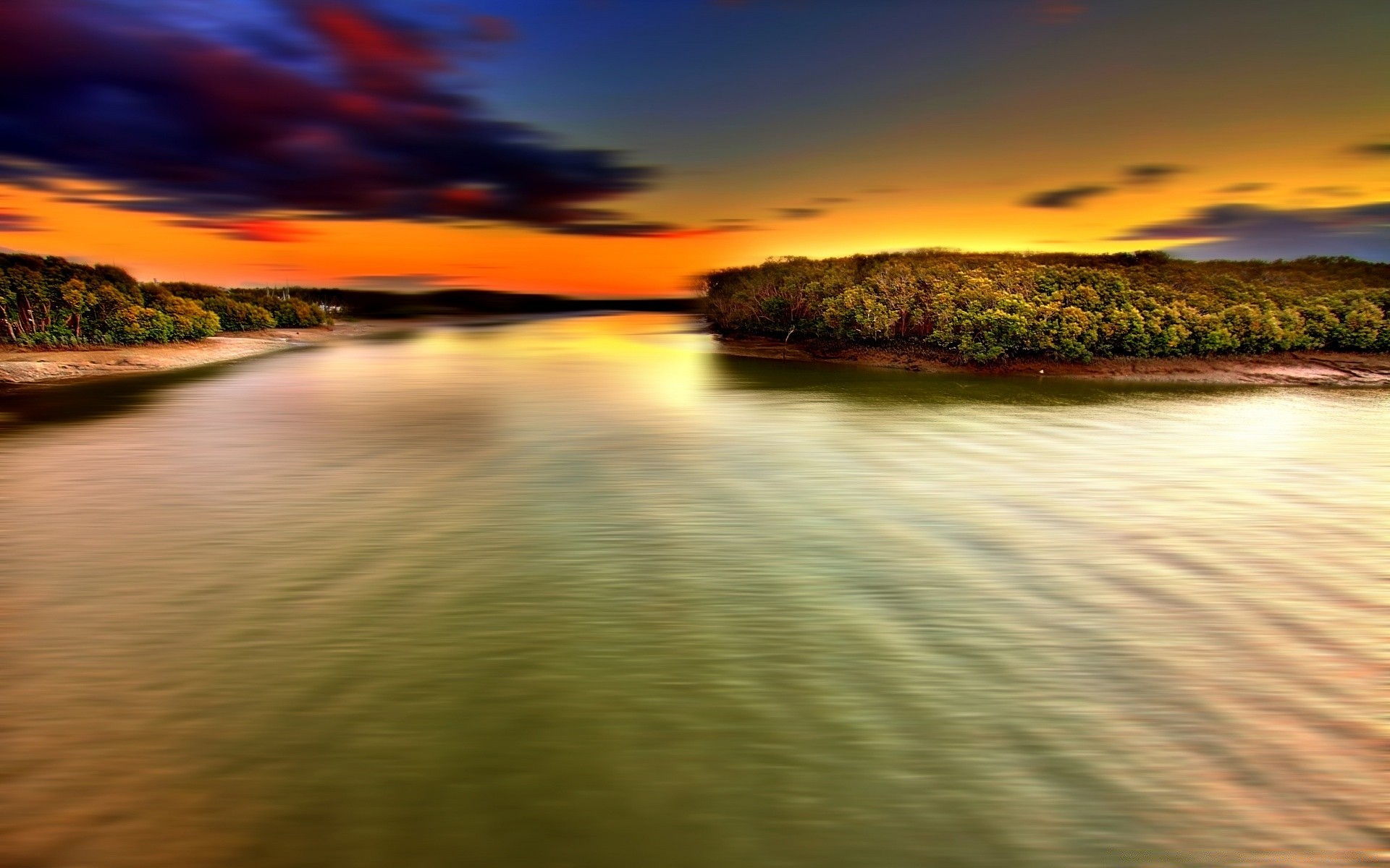 Gün batımında nehir. Ada. Plaj
