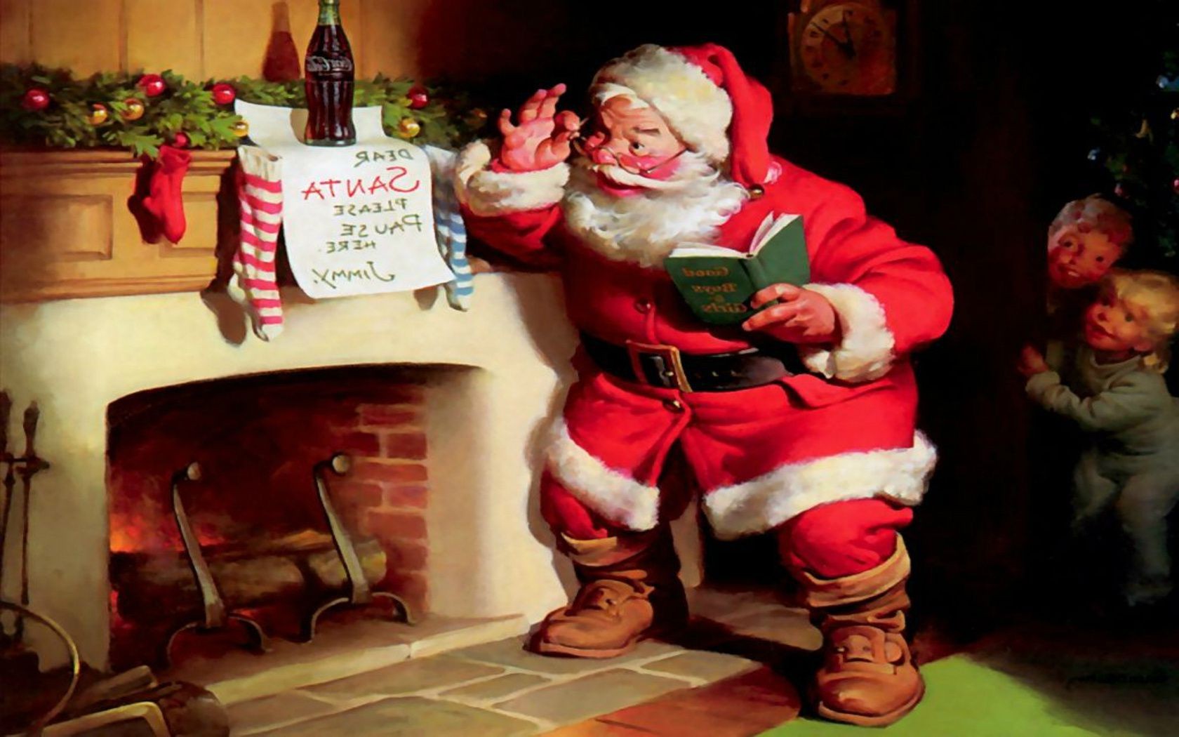 Yanan Noel şöminesinin yanındaki Noel Baba