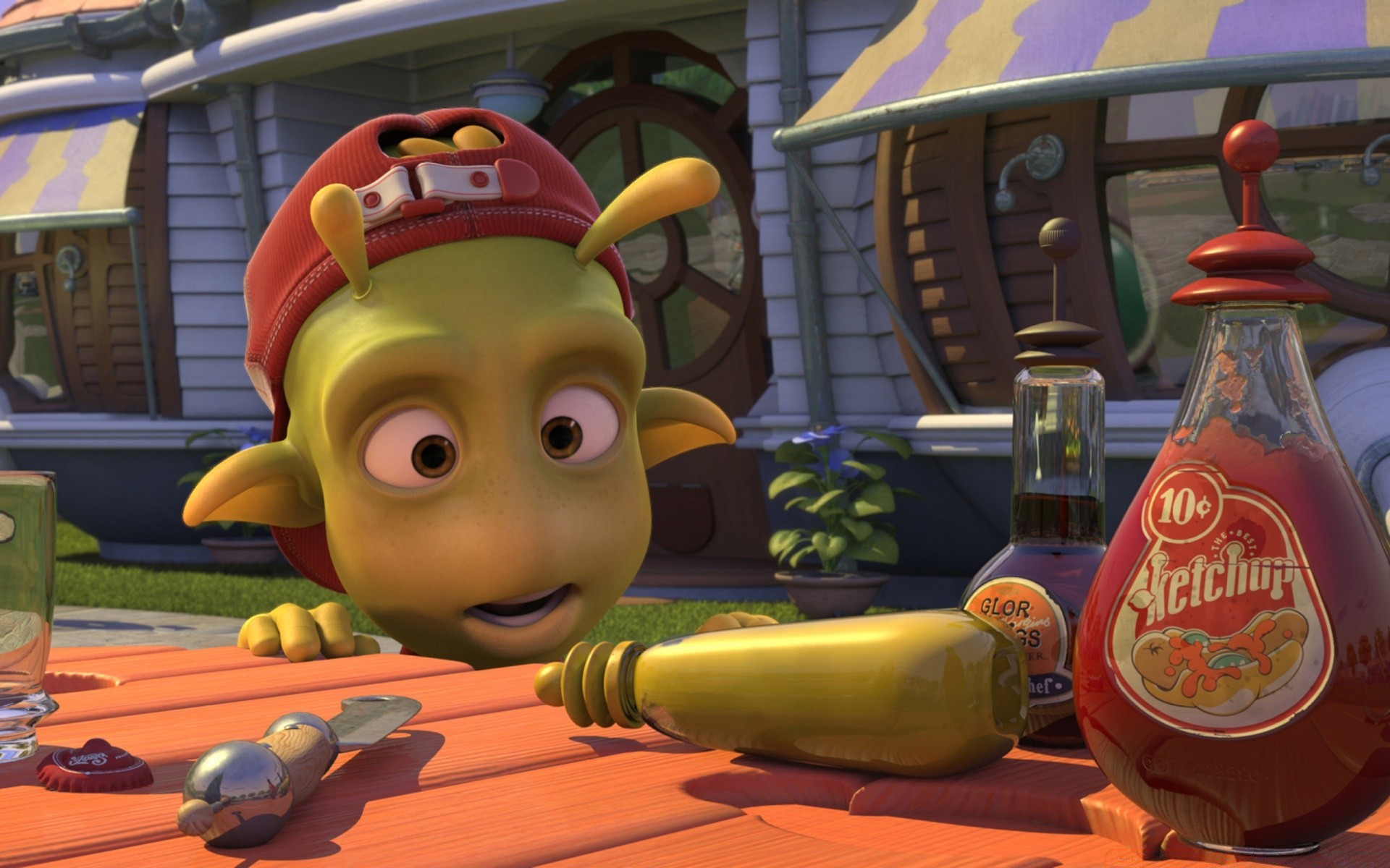 Küçük uzaylı masada oturuyor ve hardallara bakıyor