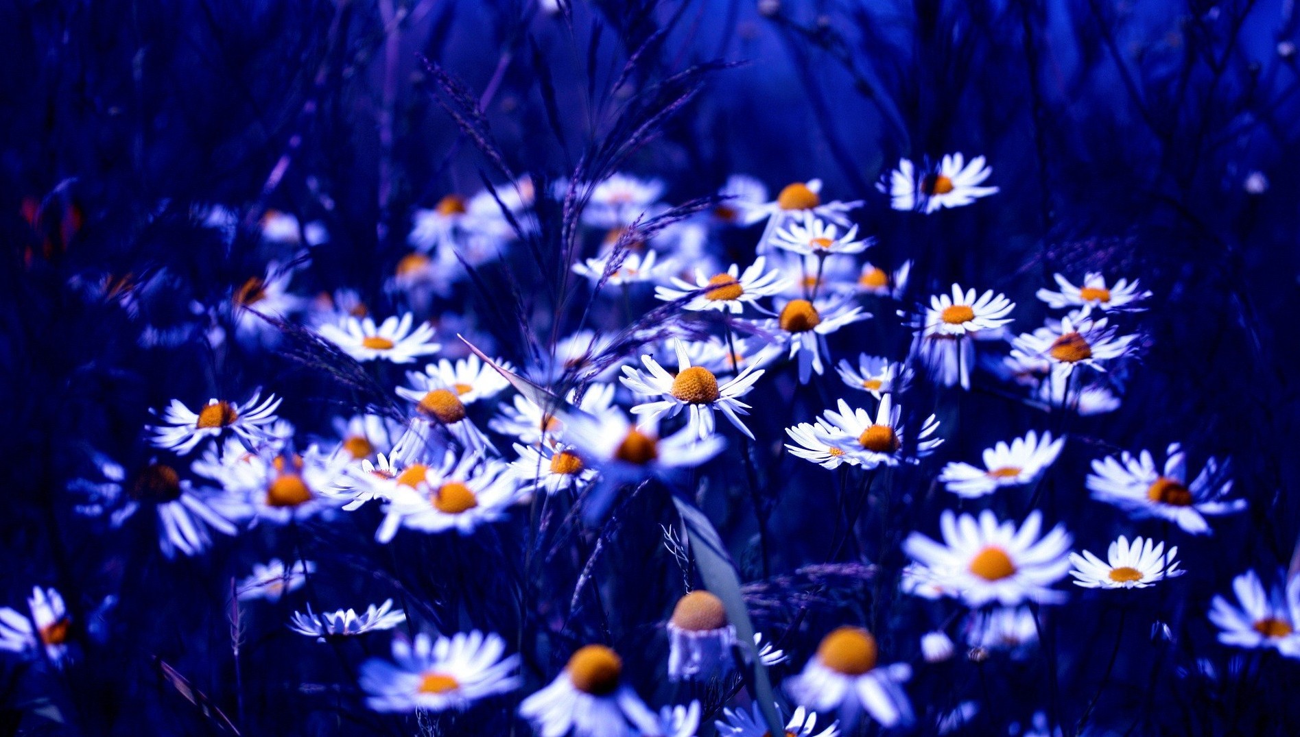 Parıltılı mavi bir arka plan üzerinde tarla papatyaları
