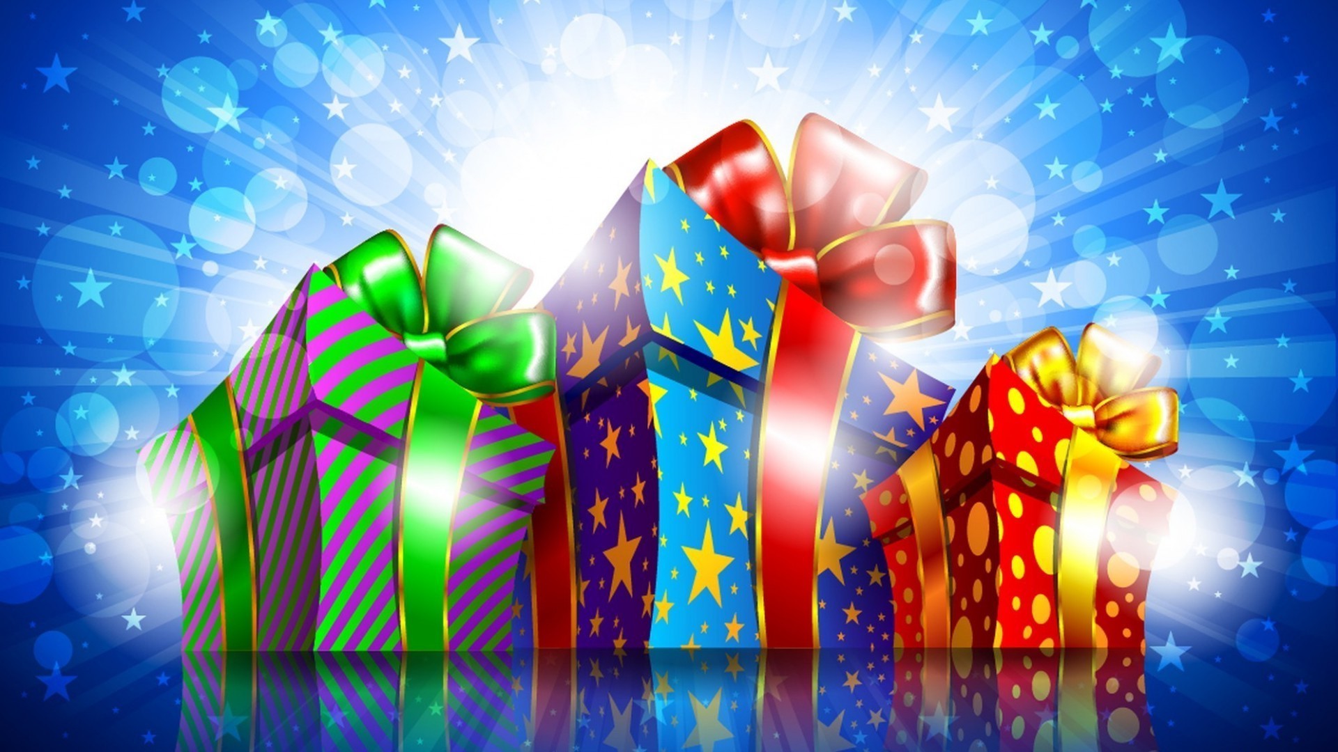 Tatil için kartpostal. Mavi bir arka plan üzerinde parlak hediyeler